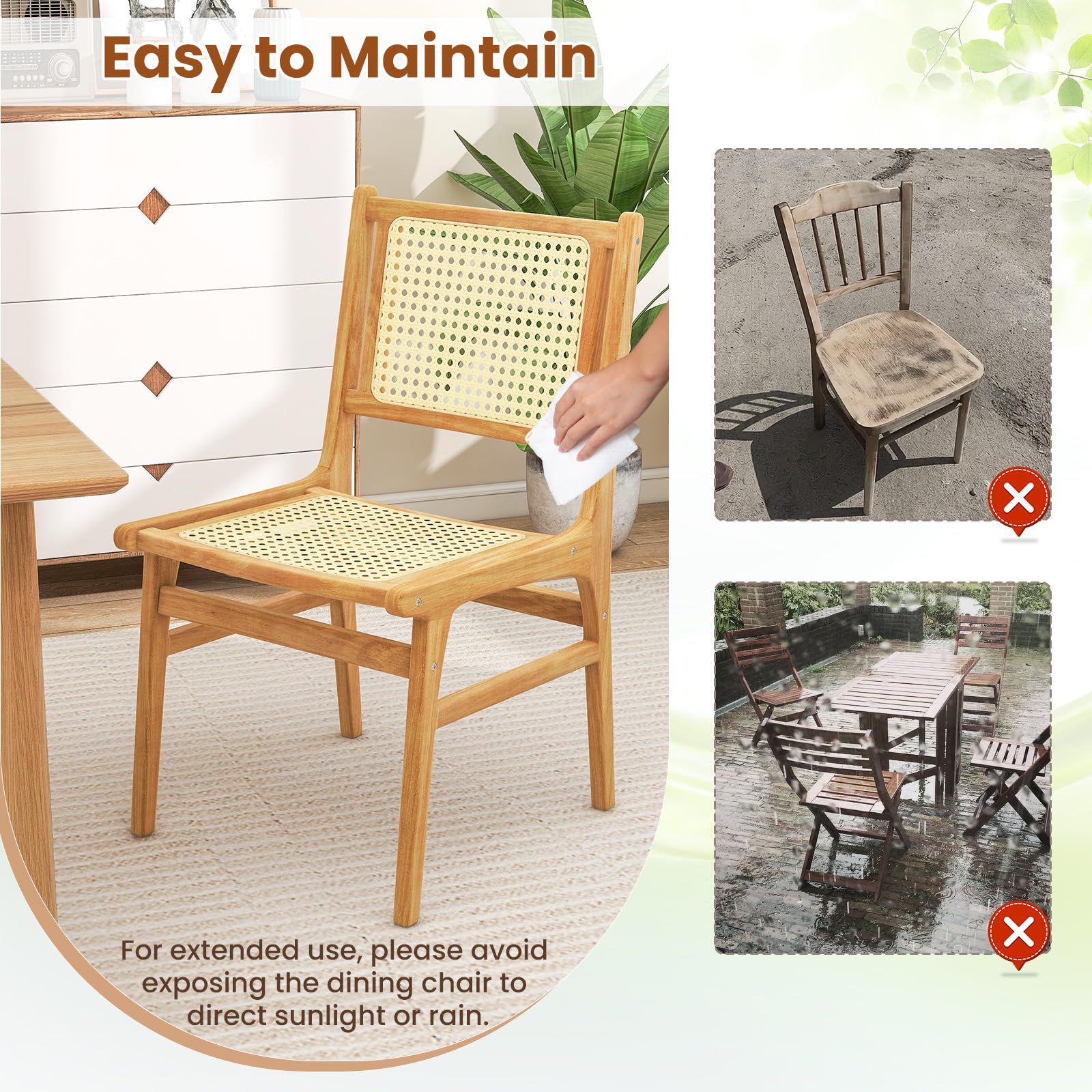 For extended use, please avoid exposing the dining chair to direct sunlight or rain