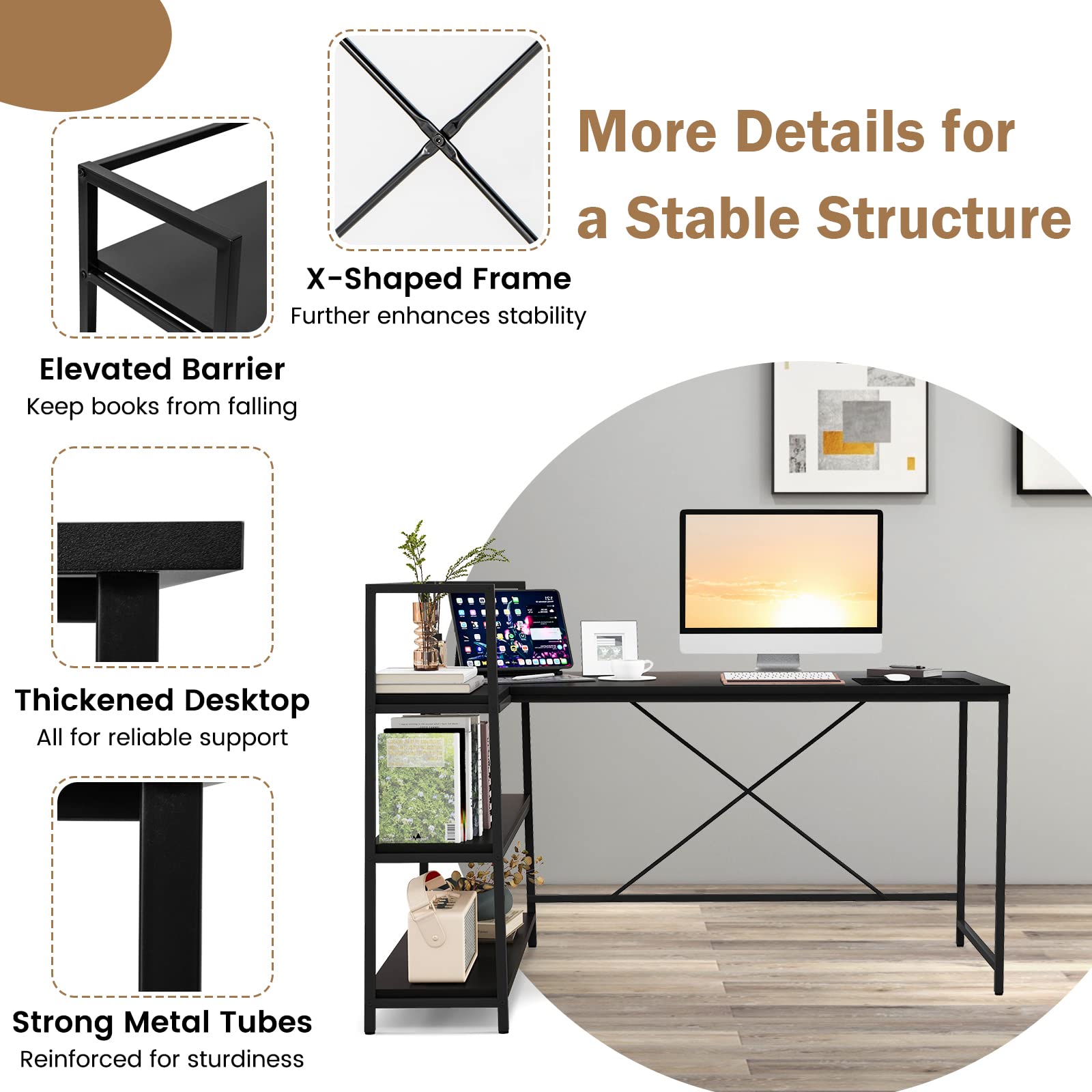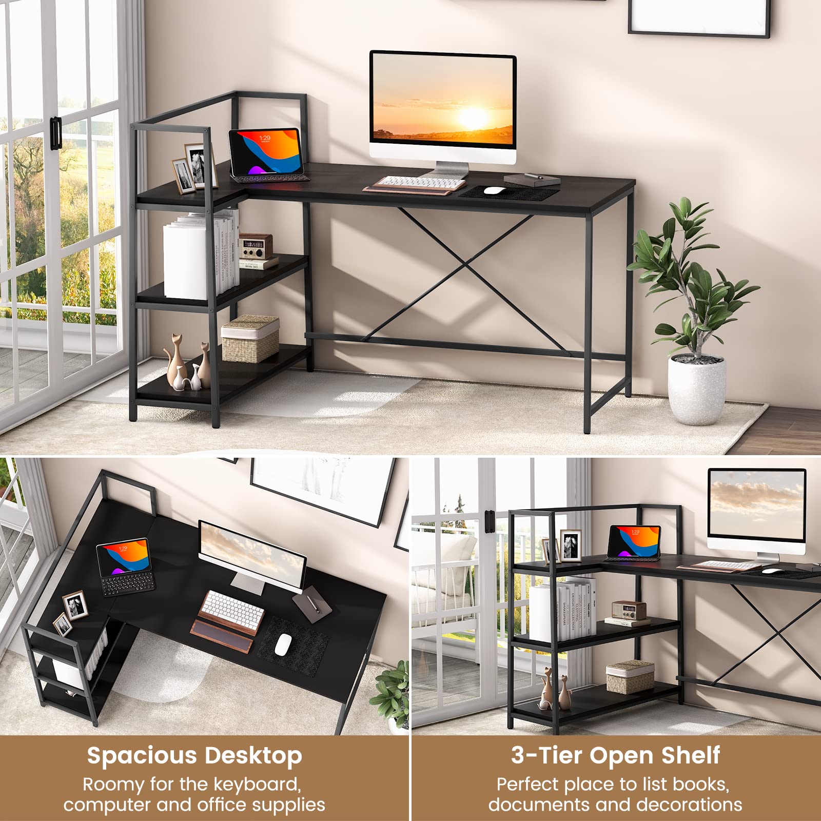 The computer desk cleverly combines a spacious desktop and a 3-tier shelf. With a reversible design, the shelf is applicable to left or right installations. Overall, you will have a roomy working zone with extra storage addition. More, the whole frame is composed of strong metal tubes with enhanced sturdiness and durability. Its adjustable pads are designed to protect the floor while gaining stability. For your preference, the study writing desk works well in the office, living room, bedroom, etc. Finally, the package includes a detailed manual for simple installation.