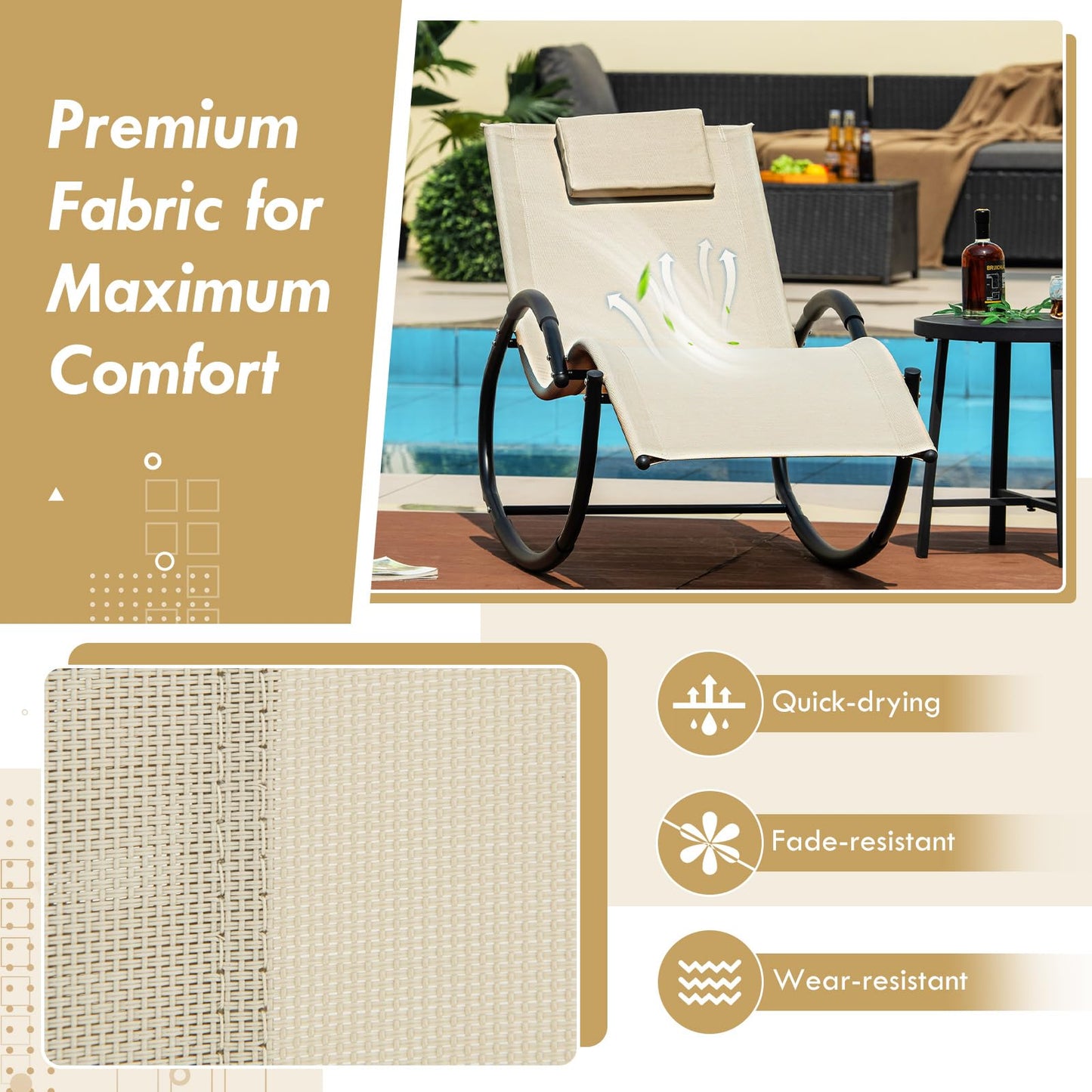 - Versatile Outdoor Addition: Whether you are sunbathing, taking a nap, or enjoying a quiet read, this outdoor rocking chair is a trustworthy companion. It offers a restful retreat in your yard, by the poolside, or in the garden.