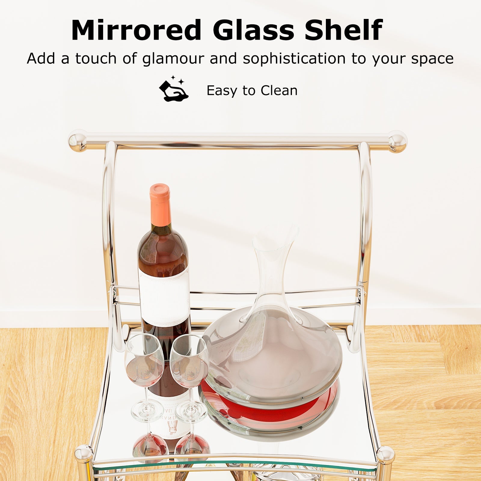• Sophisticated Mirrored Shelves: This bar cart is elegantly outfitted with?mirrored glass shelves, adding a touch of glamour and reflecting your sophisticated taste while showcasing your finest bottles and bar accessories.