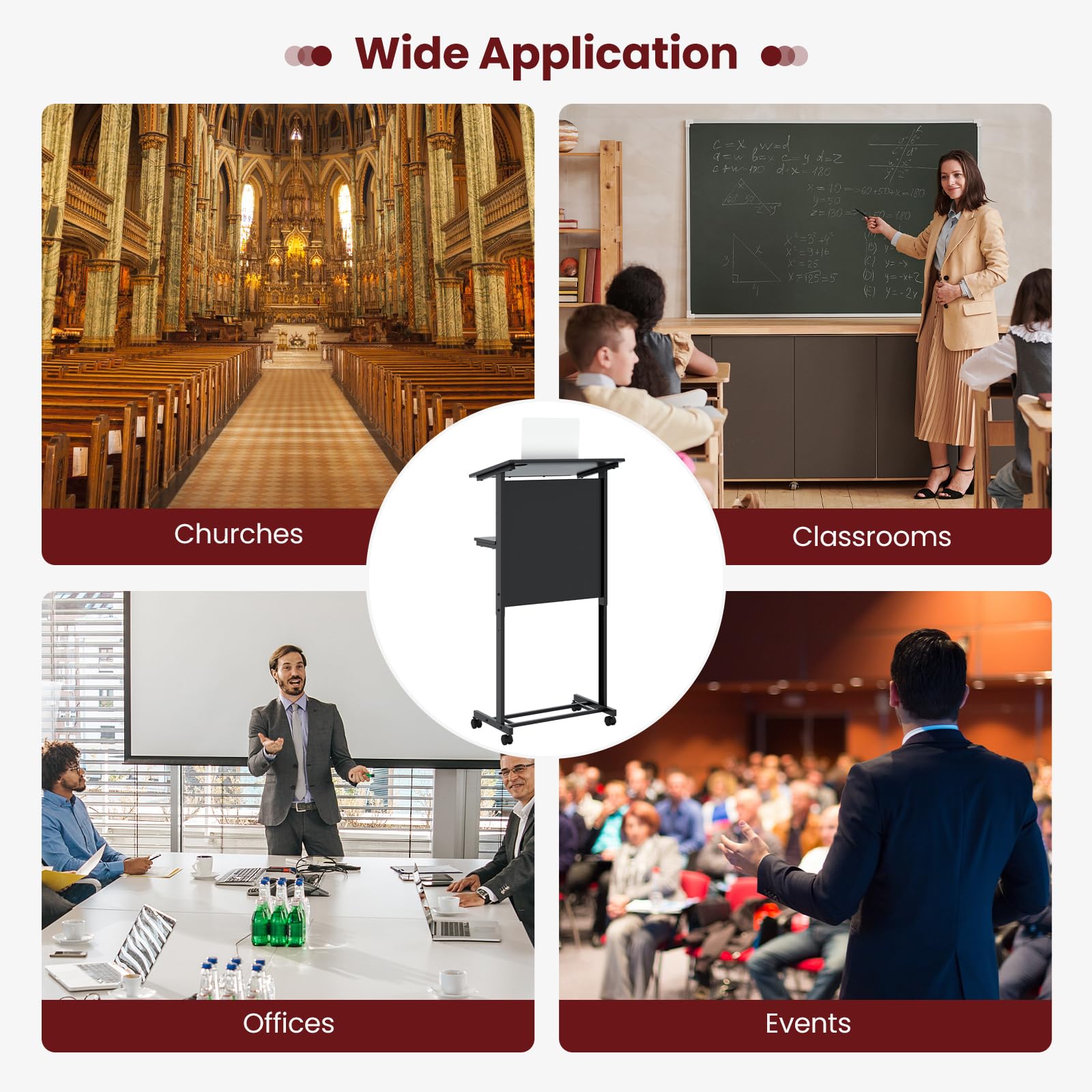 Discover the sleek, mobile, and adjustable podium perfect for any venue?Dfrom your home office to the classroom. No more back pains or clutter; this podium adjusts to 3 heights and features a smart tilt for effortless reading. Keep your notes secure with a handy edge stopper and stash extra supplies on the additional storage shelf. Tired of tangled cables? The built-in cable hole has got you covered. Effortlessly glide from one room to another on its sturdy wheels?Dlock them in when it’s showtime. Professional, portable, and prepared: this lectern table is set to elevate every presentation. Take your professional image to the next level!