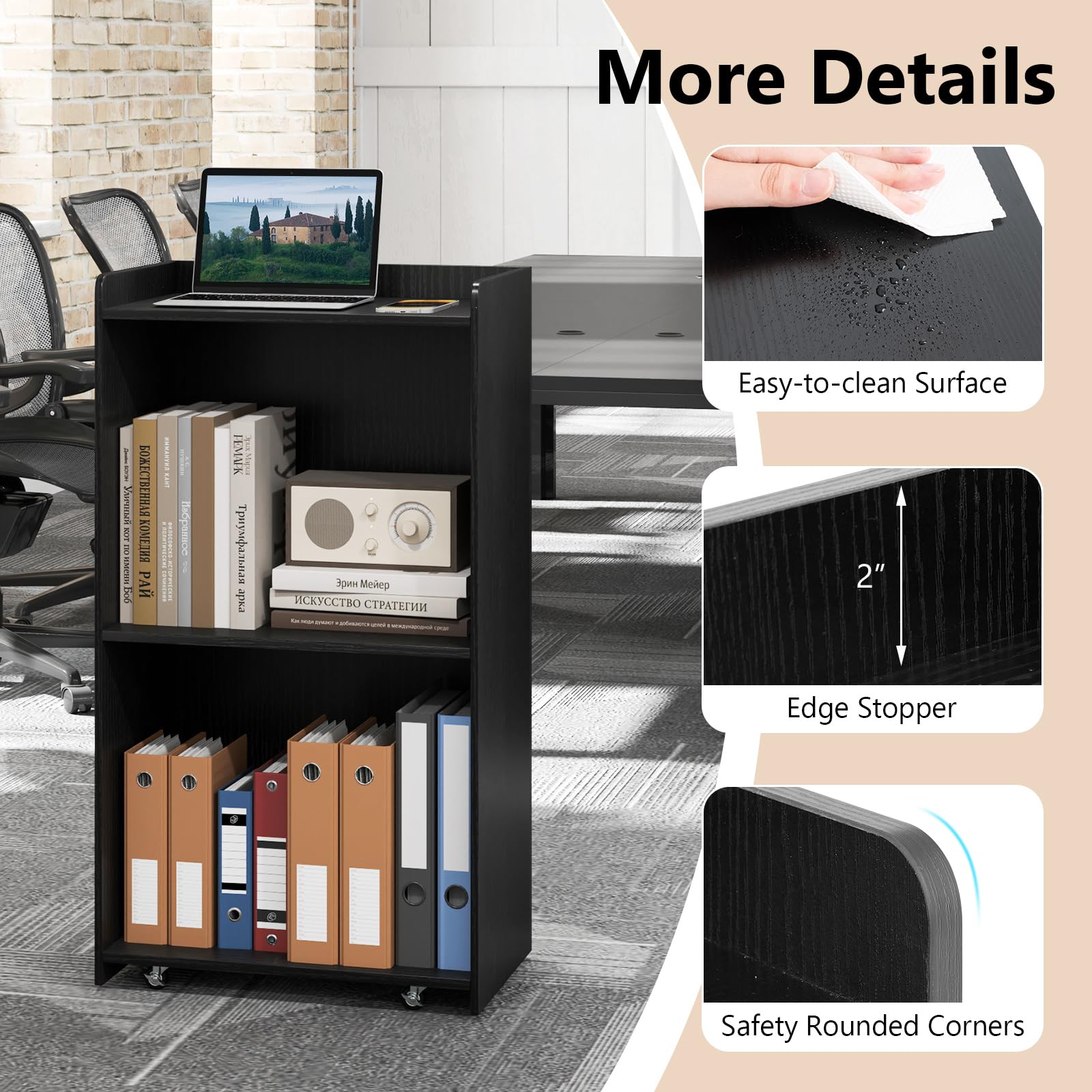 Elevate your presentations with this versatile and durable podium stand, which is designed to meet the needs of church pulpits, educator lectern stands, or retail reception desks. The rolling podium features 2 storage cubes, perfect for storing books, documents, and presentation materials. Maneuvering this stand is a breeze, thanks to the 4 universal casters, two of which are lockable for added stability during stationary use. More details showcase the better workmanship: the anti-falling guardrails on the tabletop and rounded corners prevent accidental bumps. With scratch-resistant surface of the speaker stand, maintenance is hassle-free, lasting durability for years to come. Add a touch of elegance to any setting! It is an essential piece that is suitable for a variety of scenarios.