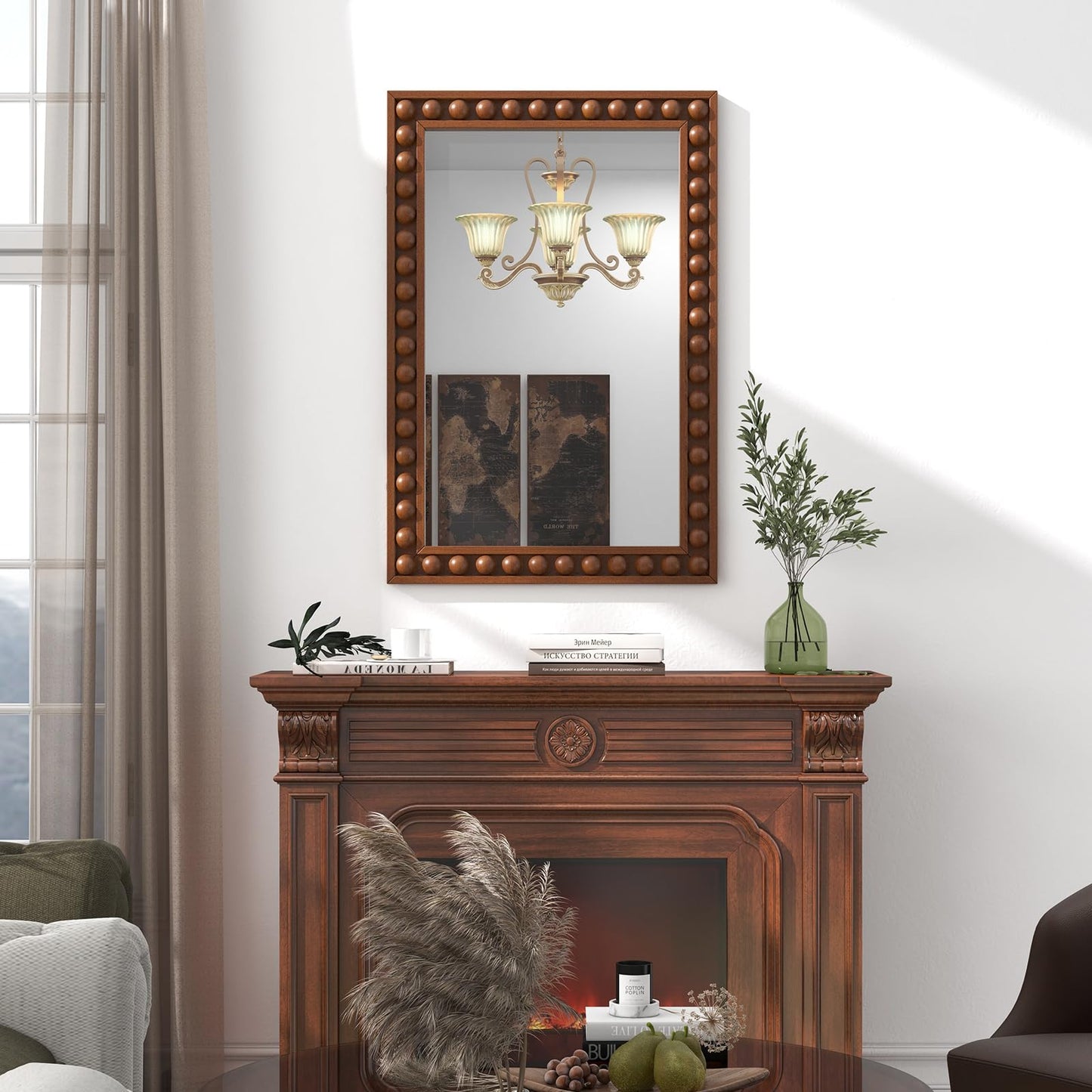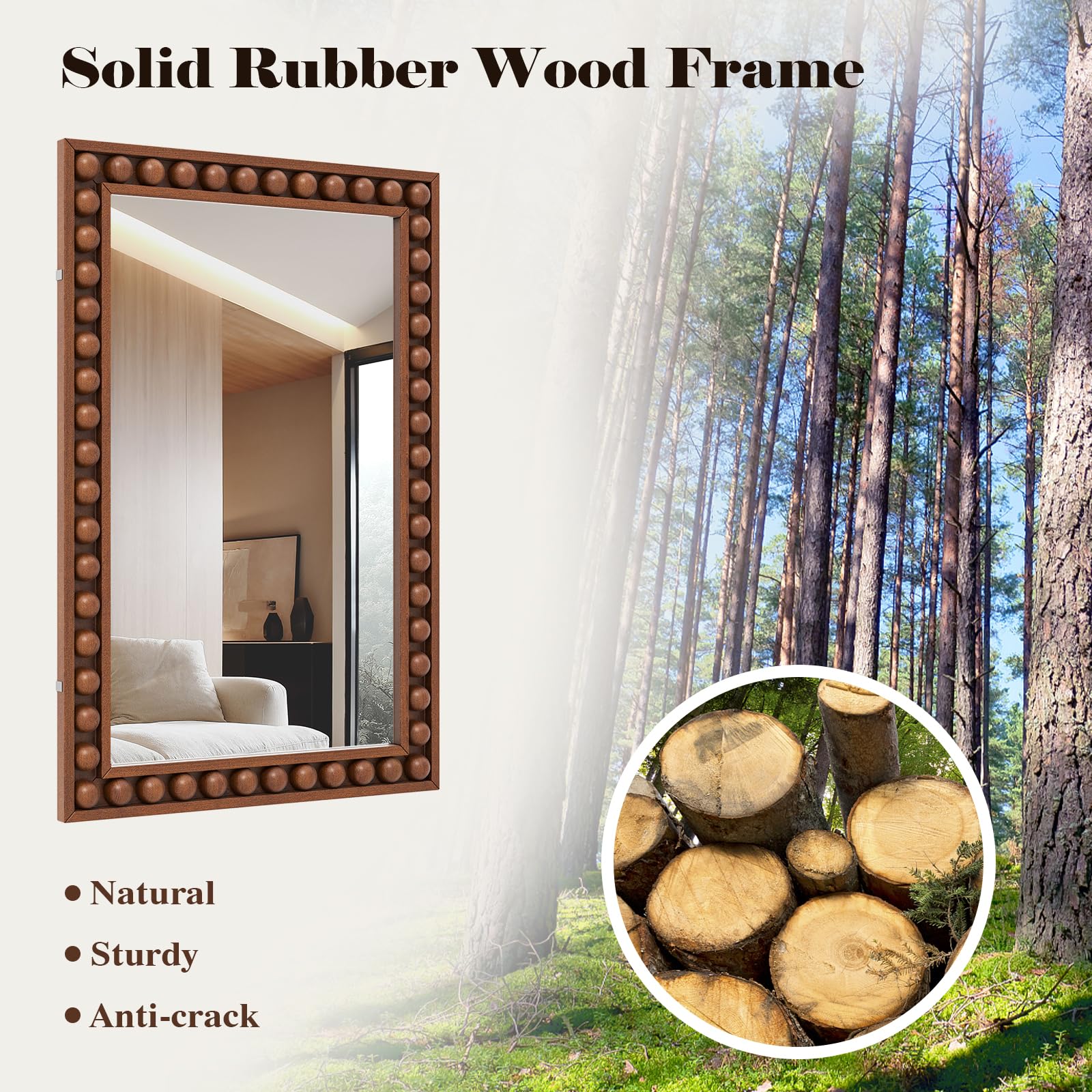 This 24" x 36" rectangle wall mirror provides a clear and undistorted reflection, making the room feel brighter and more spacious. The rubber wood frame is not only sturdy and anti-crack, but gives the mirror a warm and rustic look that fits perfectly with any farmhouse decor. Moreover, the decorative farmhouse style is accentuated by beads on the frame. Whether placed in the living room, bedroom, or entryway, this wall mounted mirror will be a perfect fit.