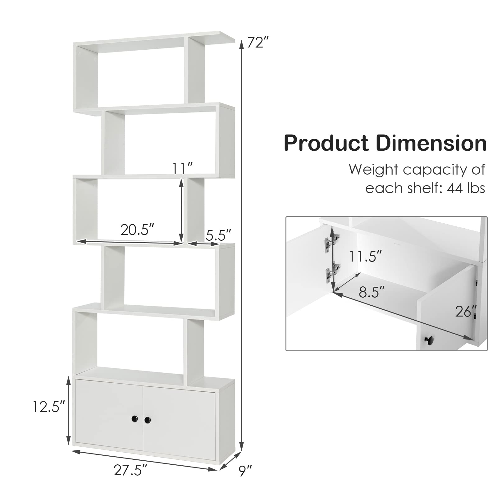 Tangkula S Shaped Bookshelf with Cabinet, 6-Tier Bookcase with Doors, Freestanding Geometric Bookshelves for Living Room