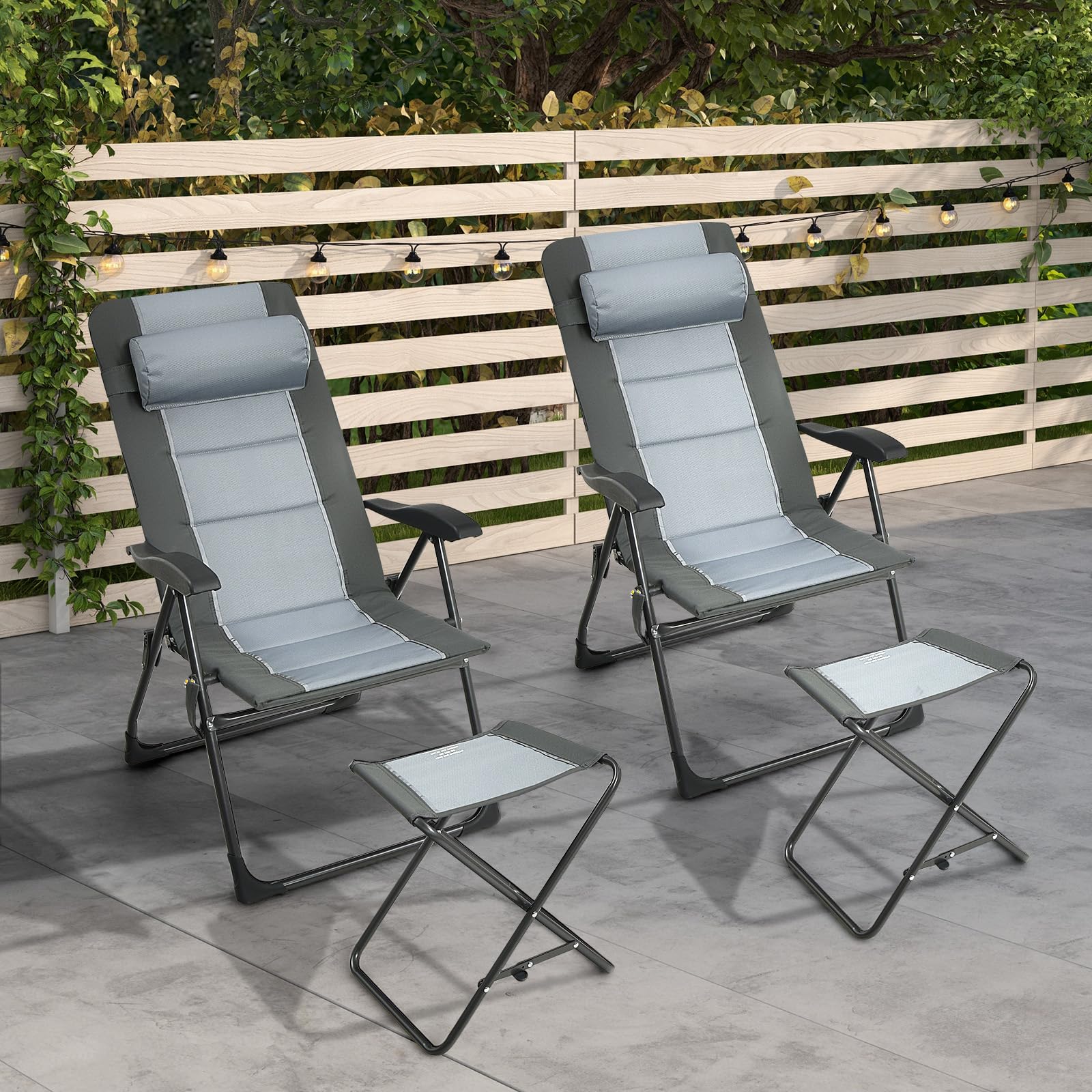 This patio set includes 2 folding chairs and 2 footstools. With a 7-position adjustable backrest, comfy headrest, and soft padded seat and backrest, these lawn chairs are designed to provide maximum comfort and support. And with the storage mesh pocket, your essentials are kept within reach. These folding recliner chairs are made from breathable oxford cloth material, ensuring durability and comfort. Made with metal frame, the dining chairs have a durable and sturdy construction with a weight capacity of 300 lbs. Portable and versatile, these reclining folding chairs and ottomans are the ideal companion for picnics, camping trips, and enjoying meals in the fresh air.