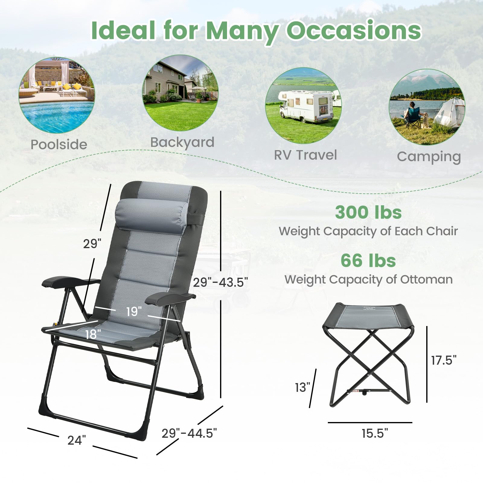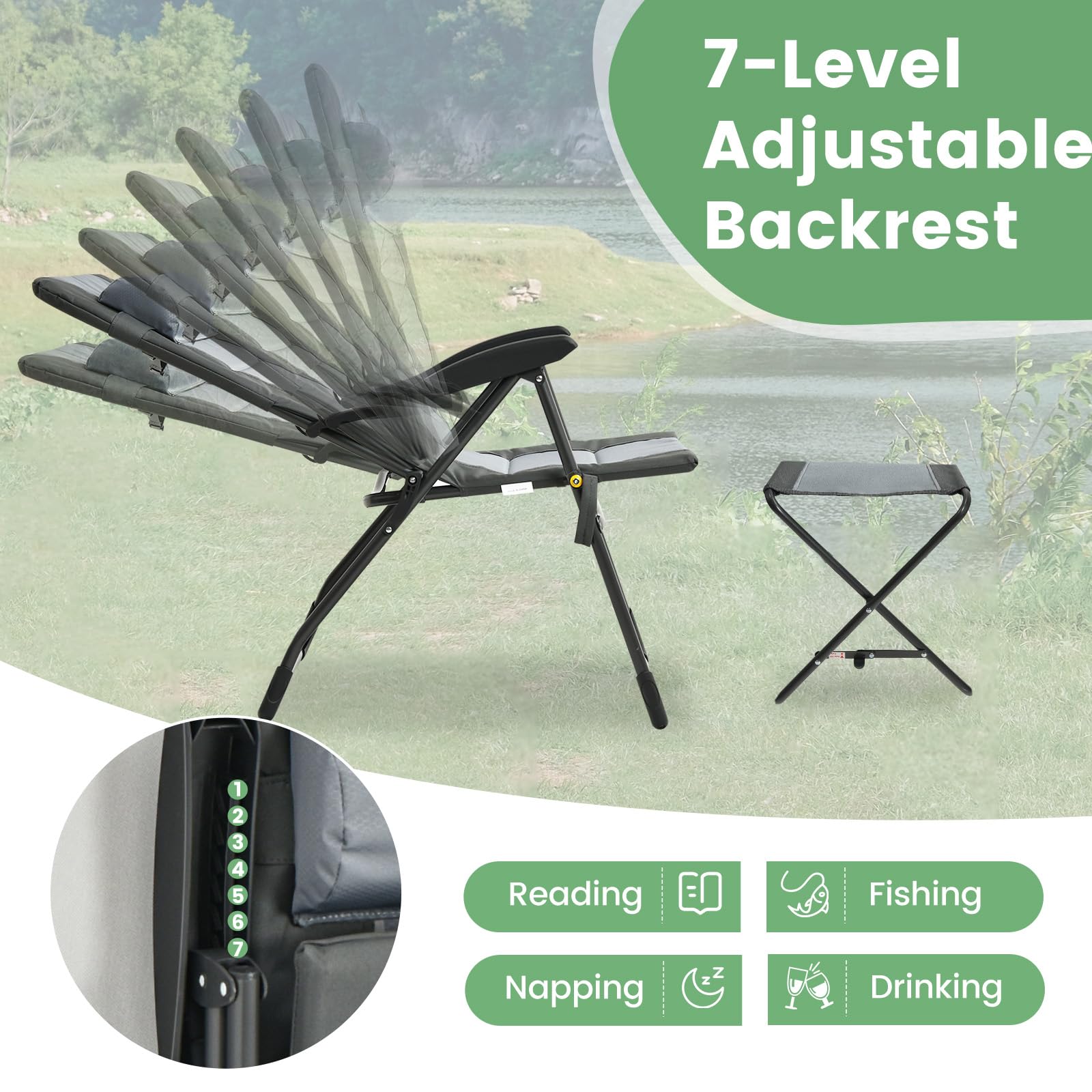 - 7-Level Adjustable Backrest with Ottoman: Our padded lawn chair features a 7-level adjustable backrest for support and comfort. Find your ideal reclining position for ultimate relaxation, whether it's reading, drinking, fishing or napping. The matching ottoman provides a comfortable place to rest your legs. Max weight for ottoman: 66 lbs.