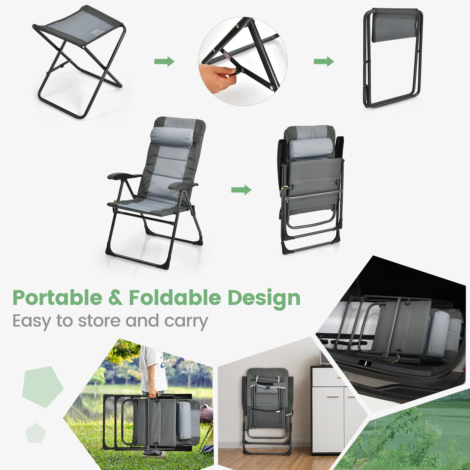 - Padded Armchairs with Headrests: With padded seat and backrest, these foldable armchairs provide unmatched comfort. The removable and adjustable headrest provides added support for your neck and helps alleviate any discomfort. Plus, the storage mesh pocket keeps your essentials within reach, making your outdoor time more enjoyable.