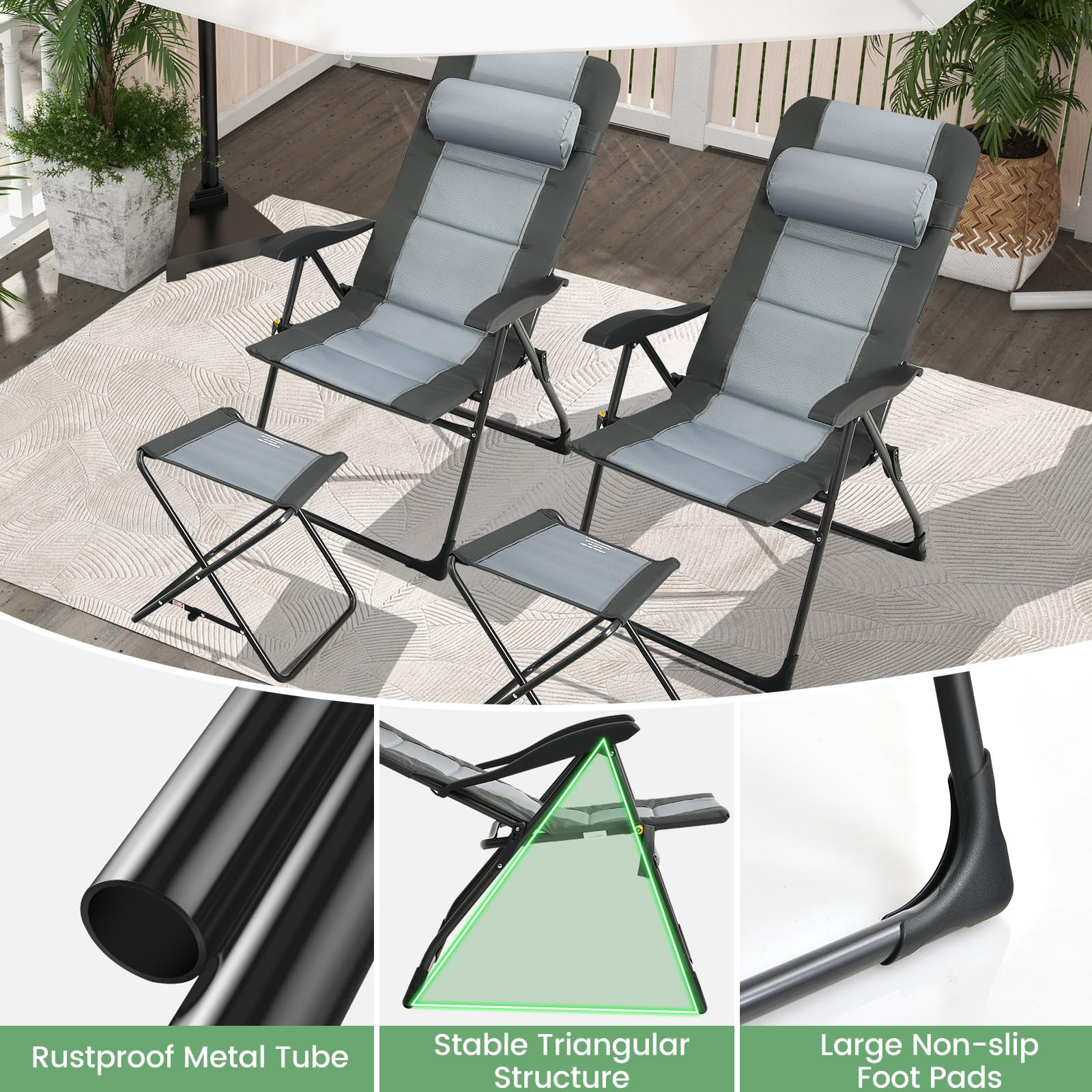 - Heavy-duty Metal Construction: Crafted from heavy duty metal frame, our dining chairs and ottoman are built to last. The robust construction can support up to 300 lbs, making these chairs perfect for outdoor activities. The triangular structure, combined with large non-slip foot pads, ensures enhanced stability for worry-free lounging.