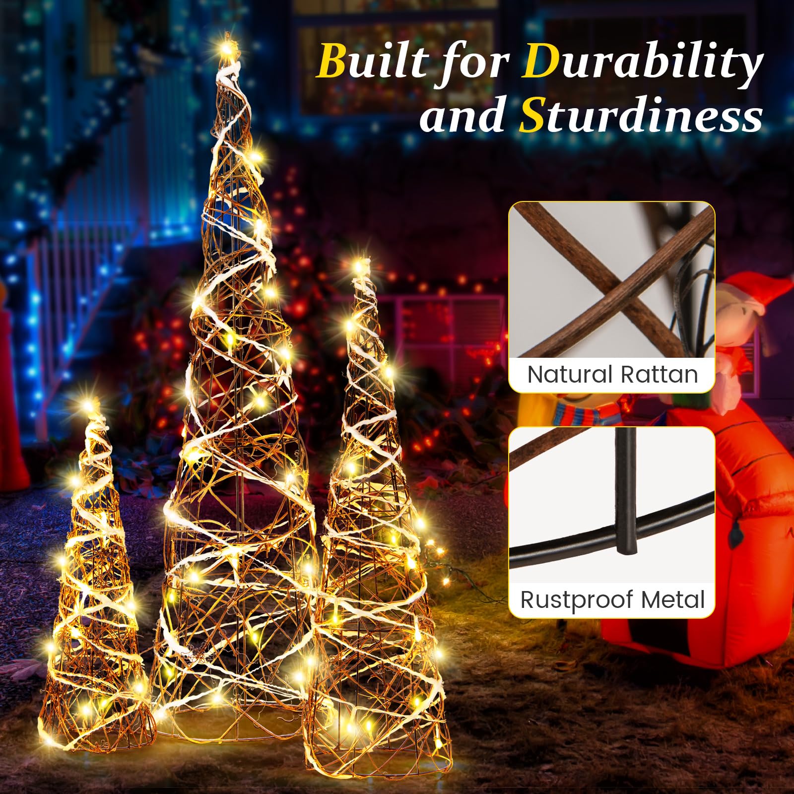 Tangkula Set of 3 Lighted Christmas Rattan Cone Trees, Holiday Decorative Trees with LED Lights and Metal Frame
