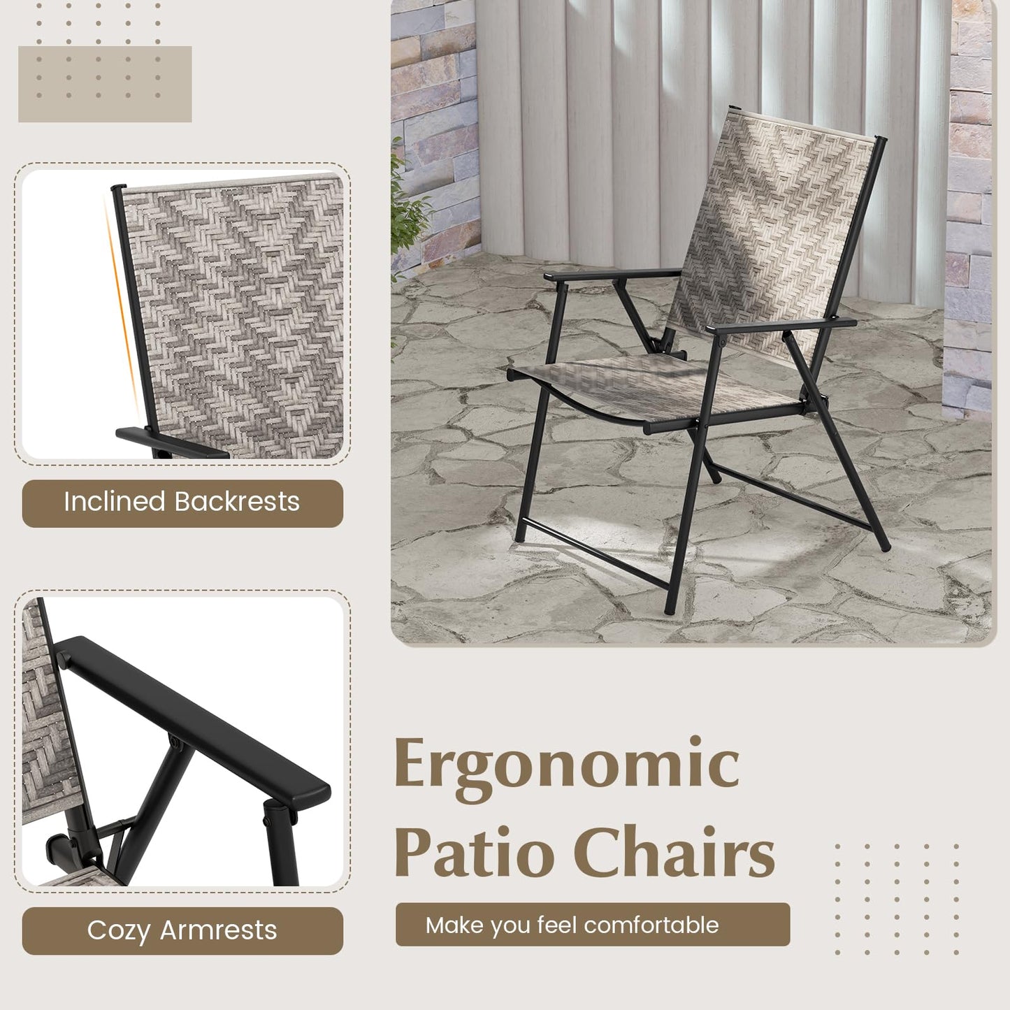 - Ergonomic Armchairs: These patio folding chairs feature inclined backrests and cozy armrests to make you feel comfortable. And 19” x 16” seat size provides you with sufficient sitting area.