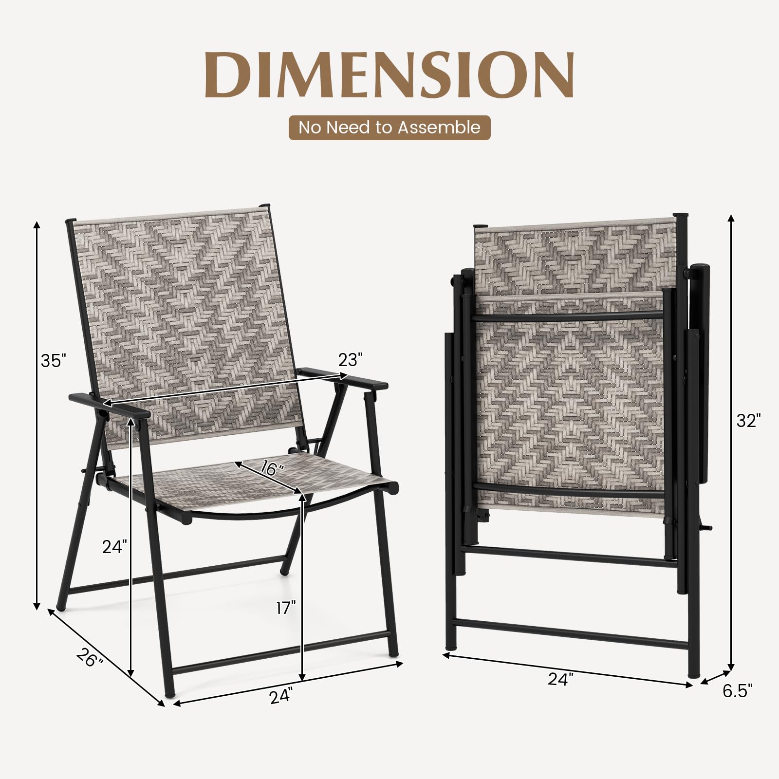 - Product Dimension: With 24”L x 26”W x 35”H unfolding dimension and 17” seat height, these ergonomic patio chairs match your dining table (not included) perfectly. No need to assemble.