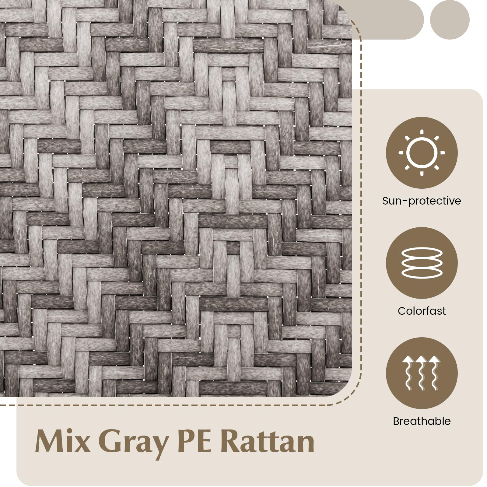 - Mix Gray PE Rattan: The seating areas are designed with selected PE rattans, which take advantage of being sun-protective and colorfast for better outdoor adaptability. And the rattan is breathable as well.