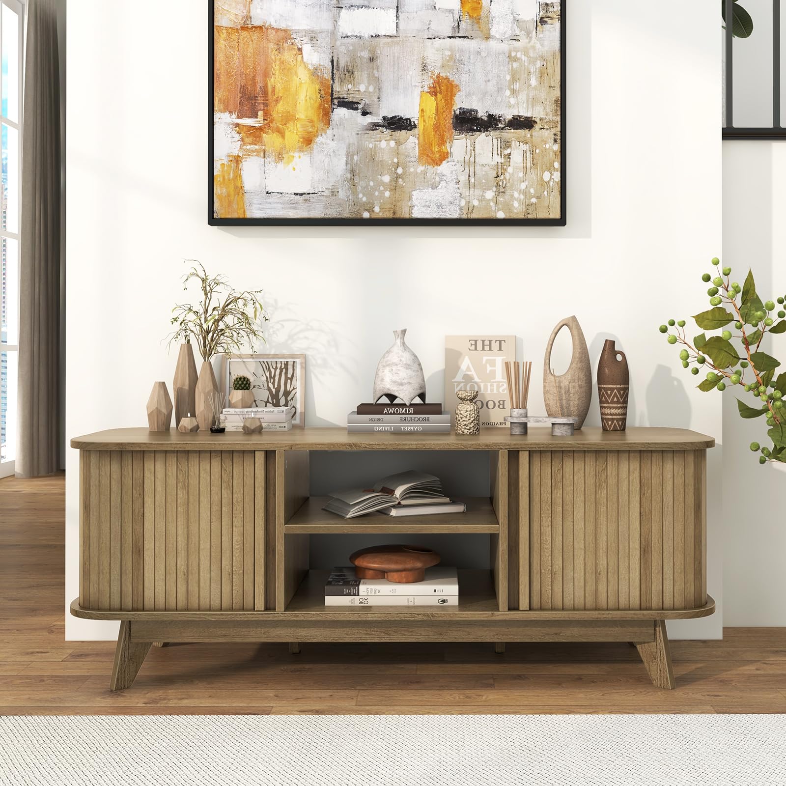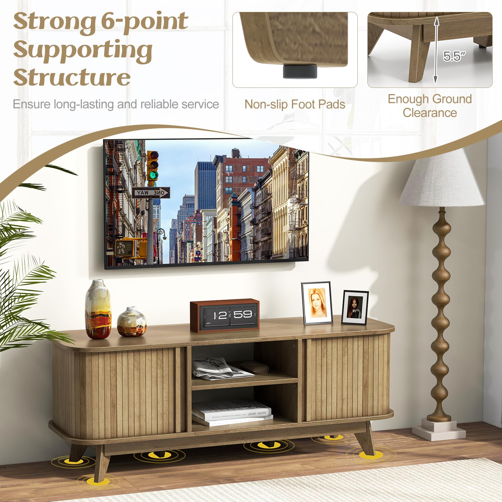 Elevate your entertainment space with our TV stand designed to accommodate up to 55-inch TVs, offering a stable display platform for immersive gaming experiences. Customize your storage needs with adjustable shelves and enclosed cabinets for optimum organization. The sturdy construction ensures a weight capacity of 200 lbs, while the convenient sliding doors provide easy access to your media collection. More details of the TV stand showcase the better workmanship, such as the nail stickers and the safe rounded corners. Infuse your space with rustic charm and versatility, as this TV stand doubles as a media console table or display cabinet, combining practicality with attractive design.