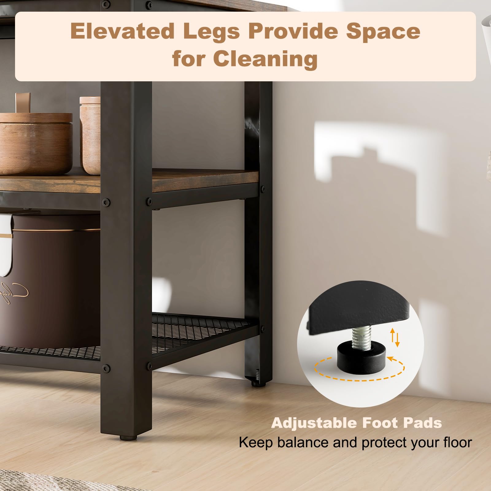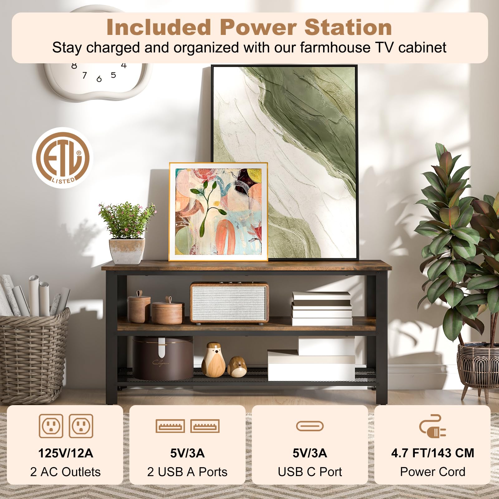 The TV stand for up to 50” TV comes with 2 open shelves. Therefore, not only can you showcase your TV in style, but you can also organize your media gear effortlessly. With included charging station, your media devices will stay charged and organized with our industrial TV cabinet. Additionally, the robust metal frame of the entertainment center provides unmatched stability and support for your TV. Moreover, the adjustable foot pads ensure that your TV is securely in place. Whether you are looking to anchor your living room entertainment, organize your bedroom media setup, or add a distinctive touch to your entryway, the versatile TV stand is the perfect choice.