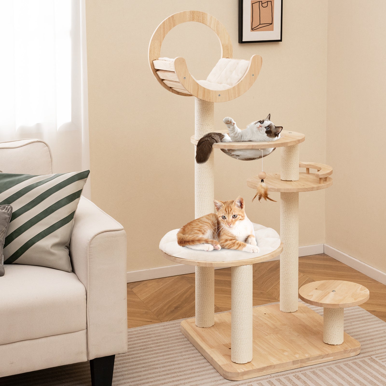- Durable & Stable Structure: The multi-level cat tree is well balanced with a wide thickened base. And the kitten activity center is crafted with solid rubber wood, which is known for its sturdiness and resistance to cracking, thus ensuring long lifespan.