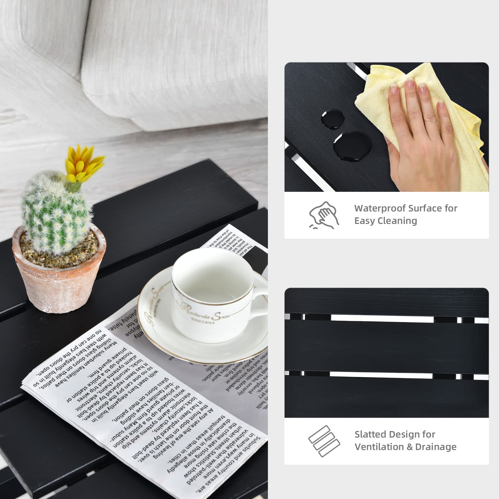 - ?【Friendly Details】The top of this wood patio side table is designed with slats, which is perfect for outdoor use. What's more, the smooth corners and refined polish enhance its safety. Then, the 15" x 15" table top provides ample space for displaying snacks and beverages.
