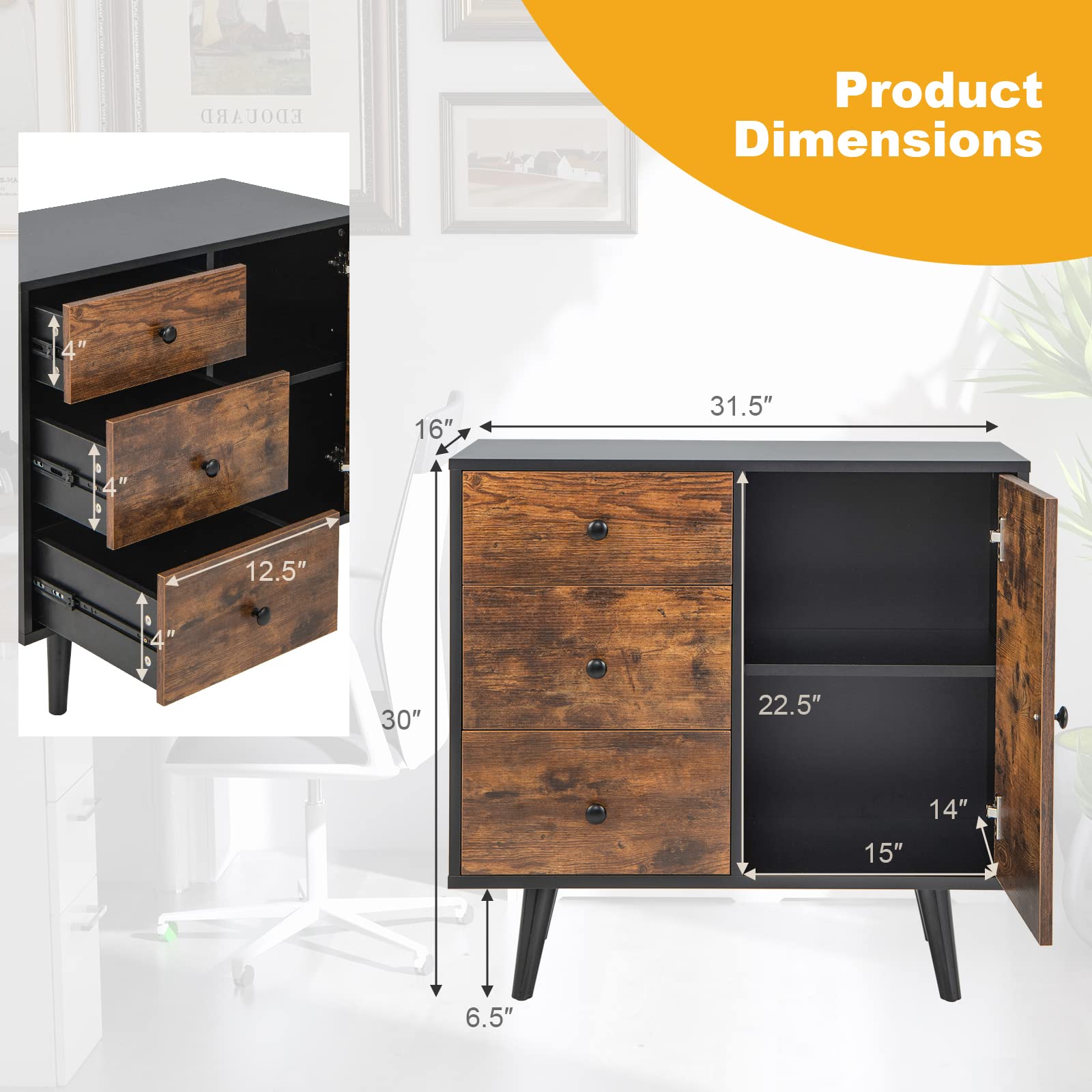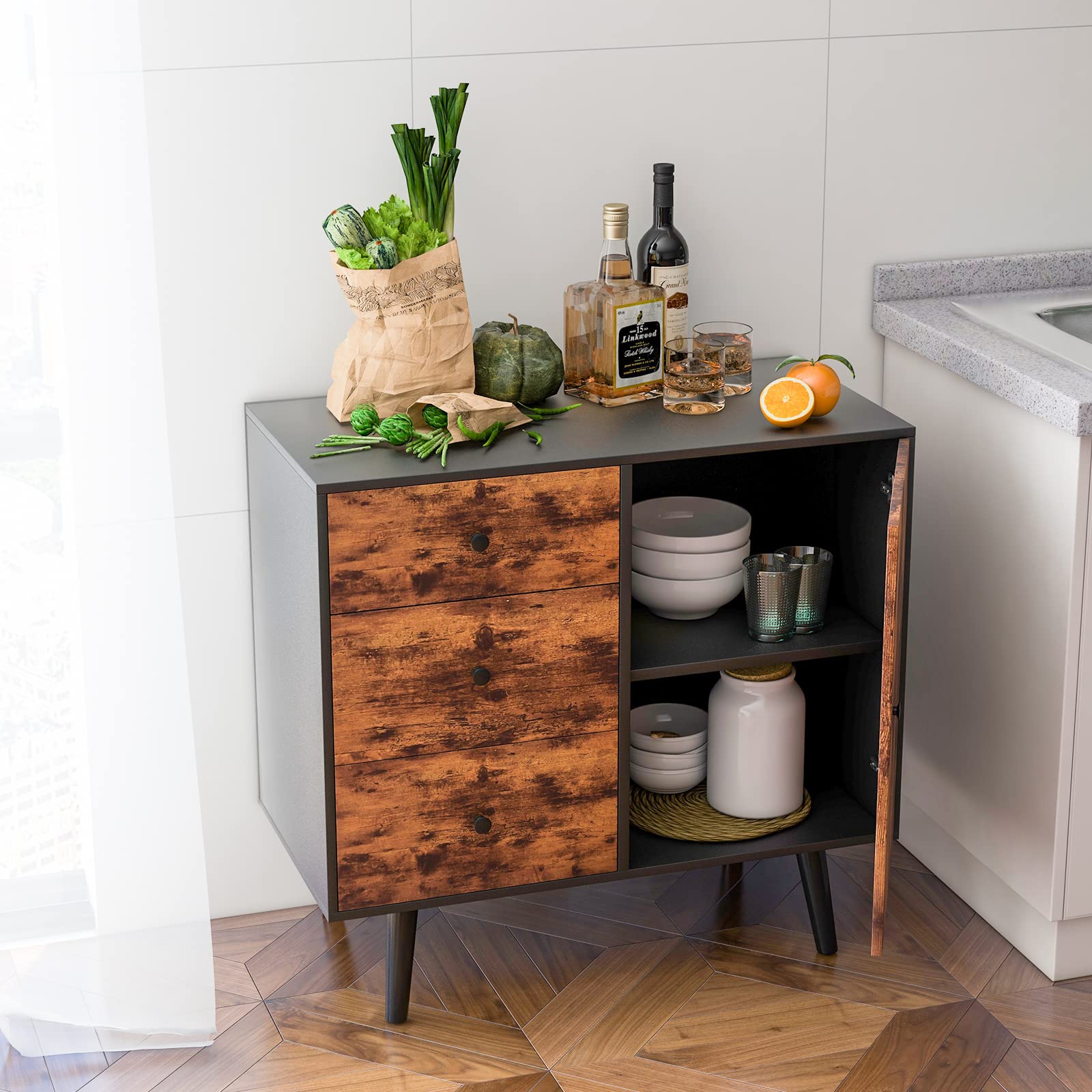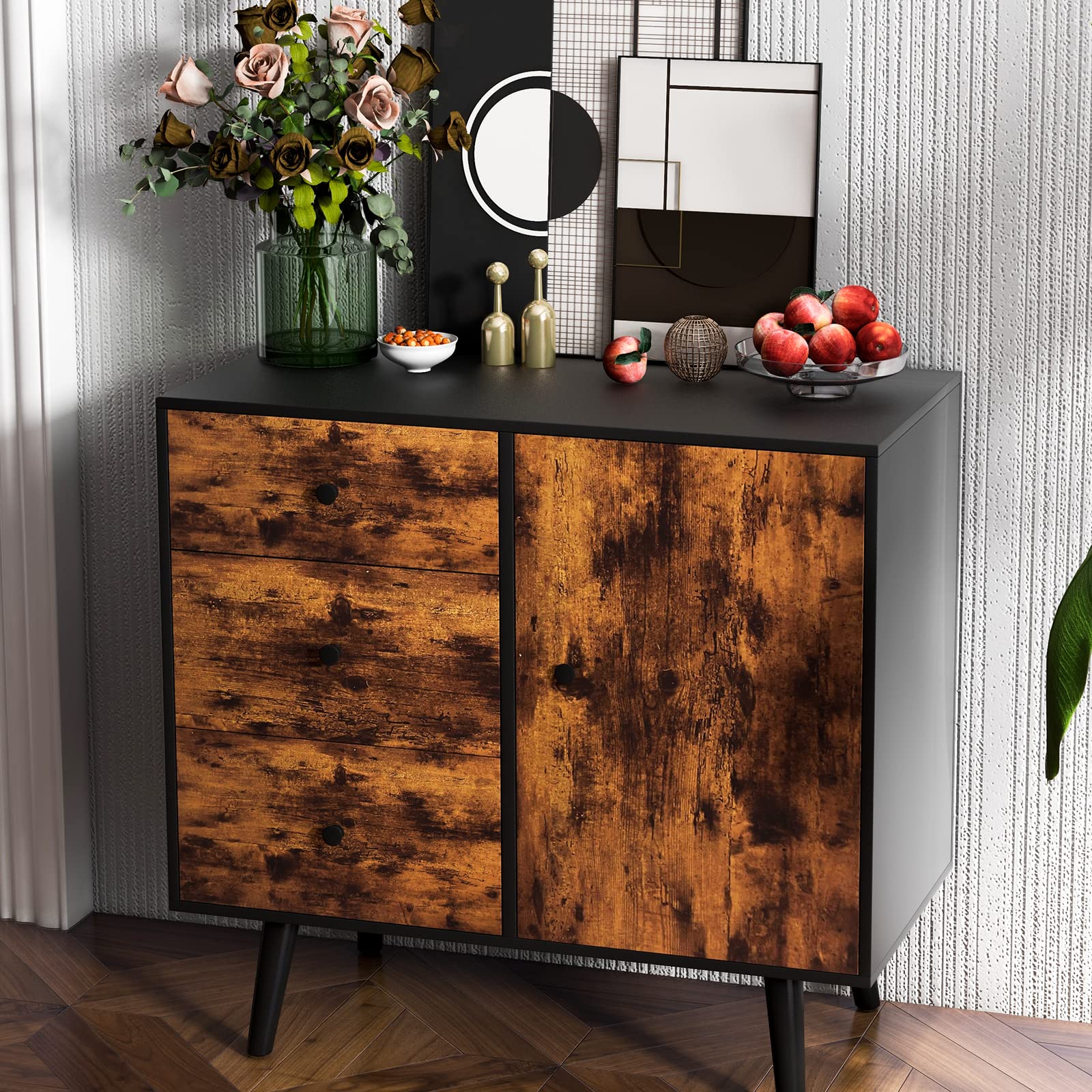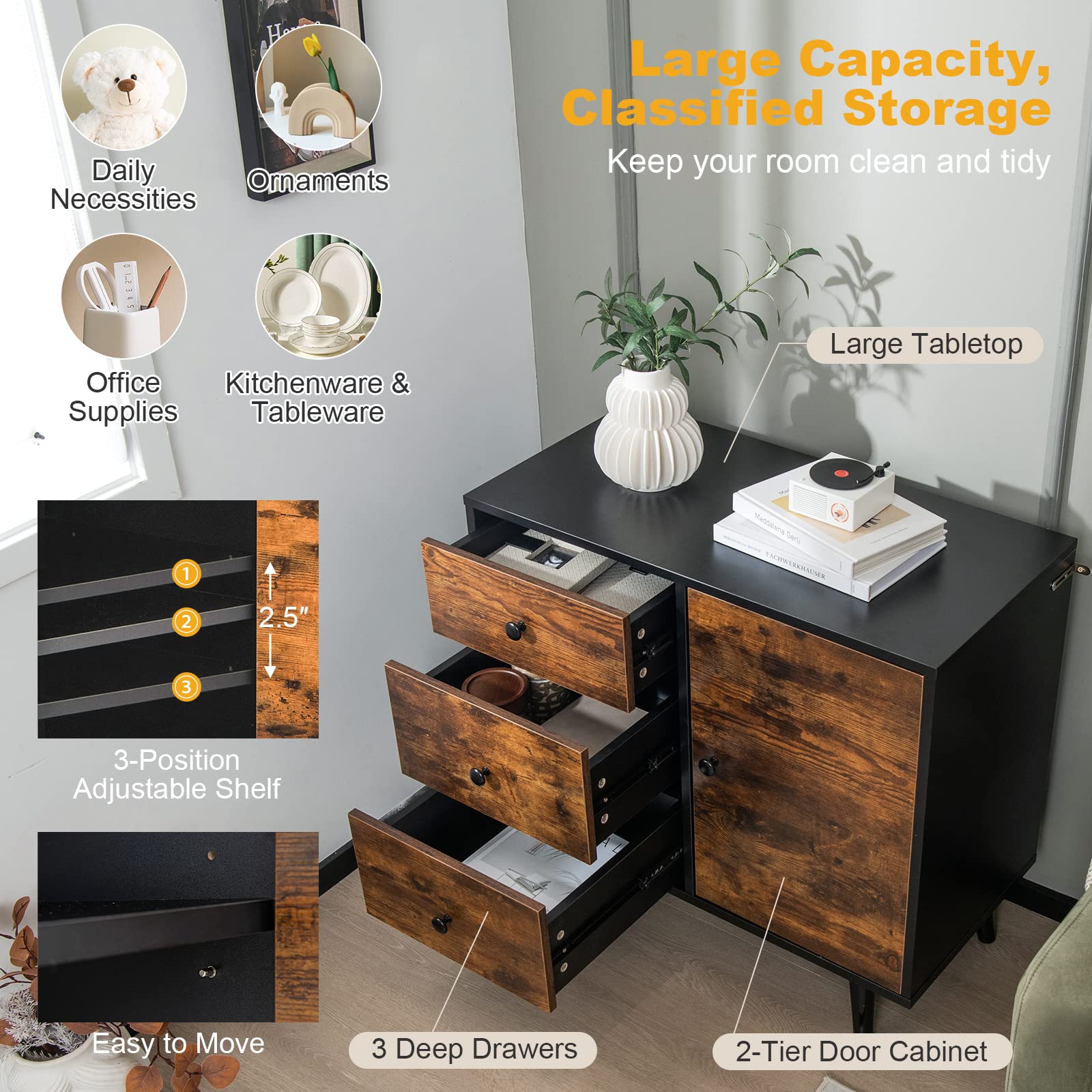 - Large Capacity & Classified Storage: The storage cabinet is designed with a 2-tier door cabinet and 3 deep drawers, providing sufficient space to store and classify your daily necessities, office supplies, kitchenware, tableware, and more. Besides, it comes with a large tabletop to display beautiful ornaments.