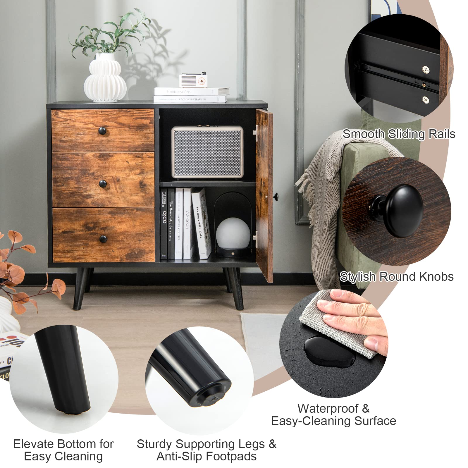 Designed with a door cabinet and 3 drawers to store and classify daily necessities