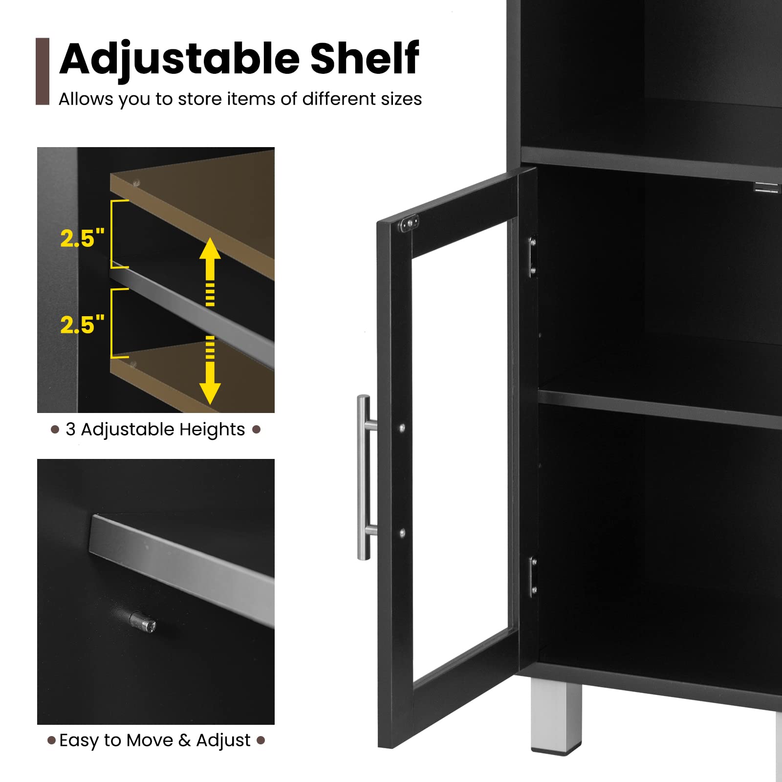 - Durable & Sturdy Construction: The storage cabinet is made up of high-quality PB board, this cabinet is sturdy and reliable. Also, the cabinet includes two tempered glass doors, which guarantees your safety for you. The transparent glass-paneled doors make it easy for you to identify your goods.