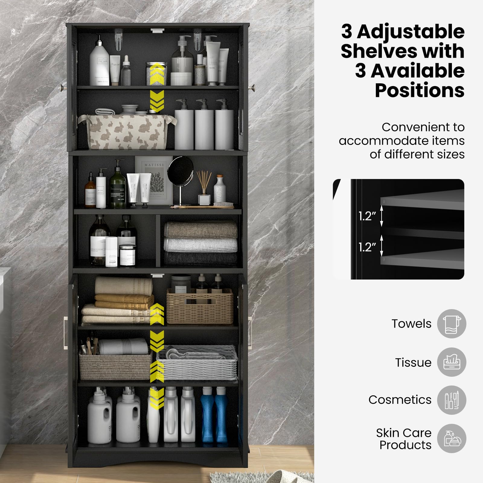 Transform your bathroom into an organized place with this spacious and versatile bathroom cabinet. Say goodbye to clutter with a top cabinet, a large compartment, 2 open shelves, and a 2-door cabinet, providing ample storage space for towels, toiletries, cosmetics, and more. The 3 adjustable shelves in cabinet make it convenient to accommodate items of different sizes (3 cm / 1.2” for each level). Crafted from premium MDF, this cabinet is stable and wear-resistant. Unlike others are vulnerable to hazard, ours is child and pet friendly. Thanks to the stable widened base, this cabinet minimizes wobbling. Safety is a top priority with 2 anti-tipping devices included for wall attachment. The upper cabinet features acrylic doors for high transparency and rustic charm, while the smooth and waterproof surface ensures effortless cleaning. Elevate your space with the modern design that complements any decor, making this cabinet suitable for use in bathrooms, living rooms, studies, or kitchens.