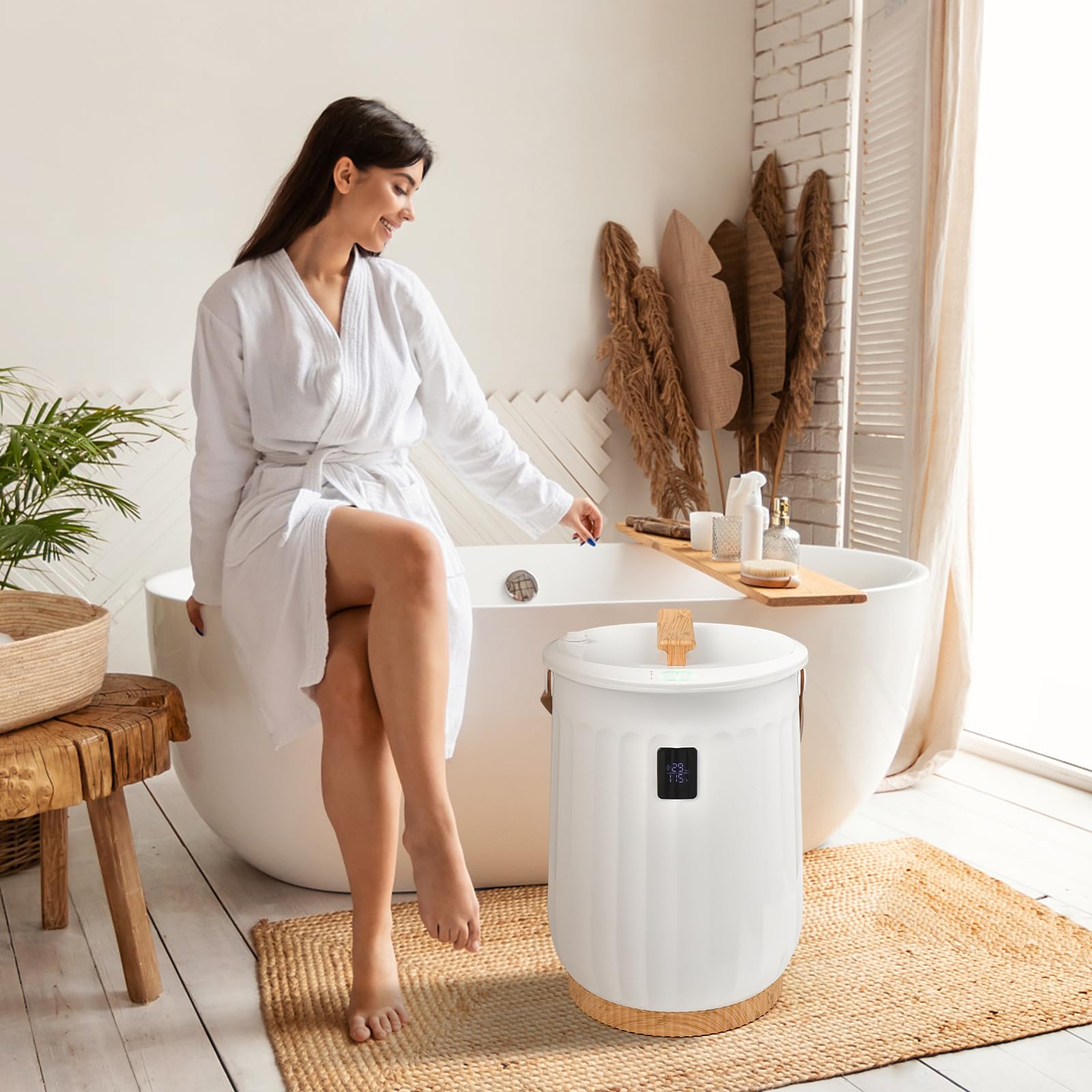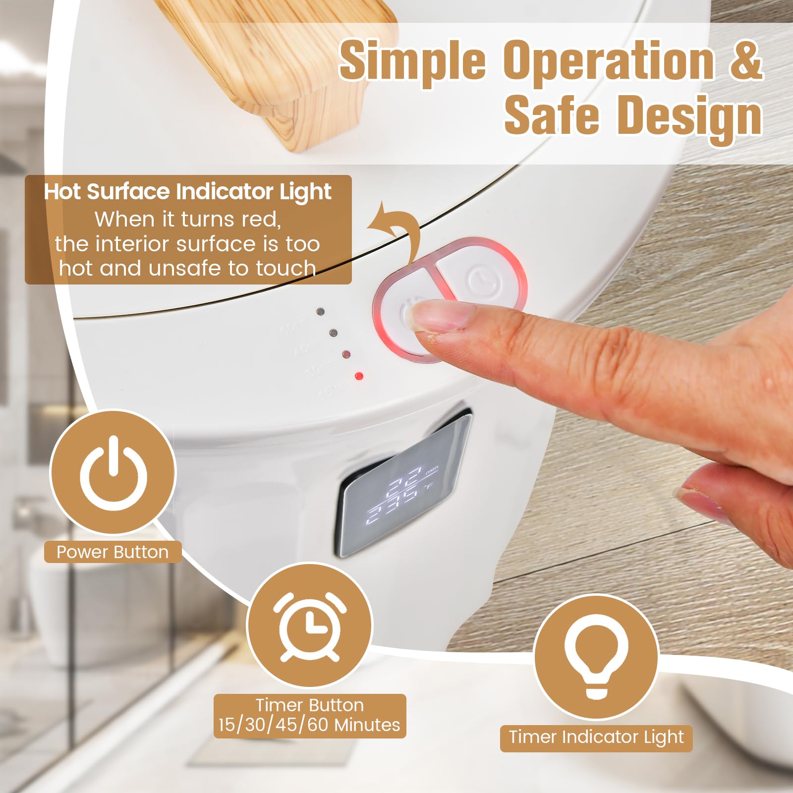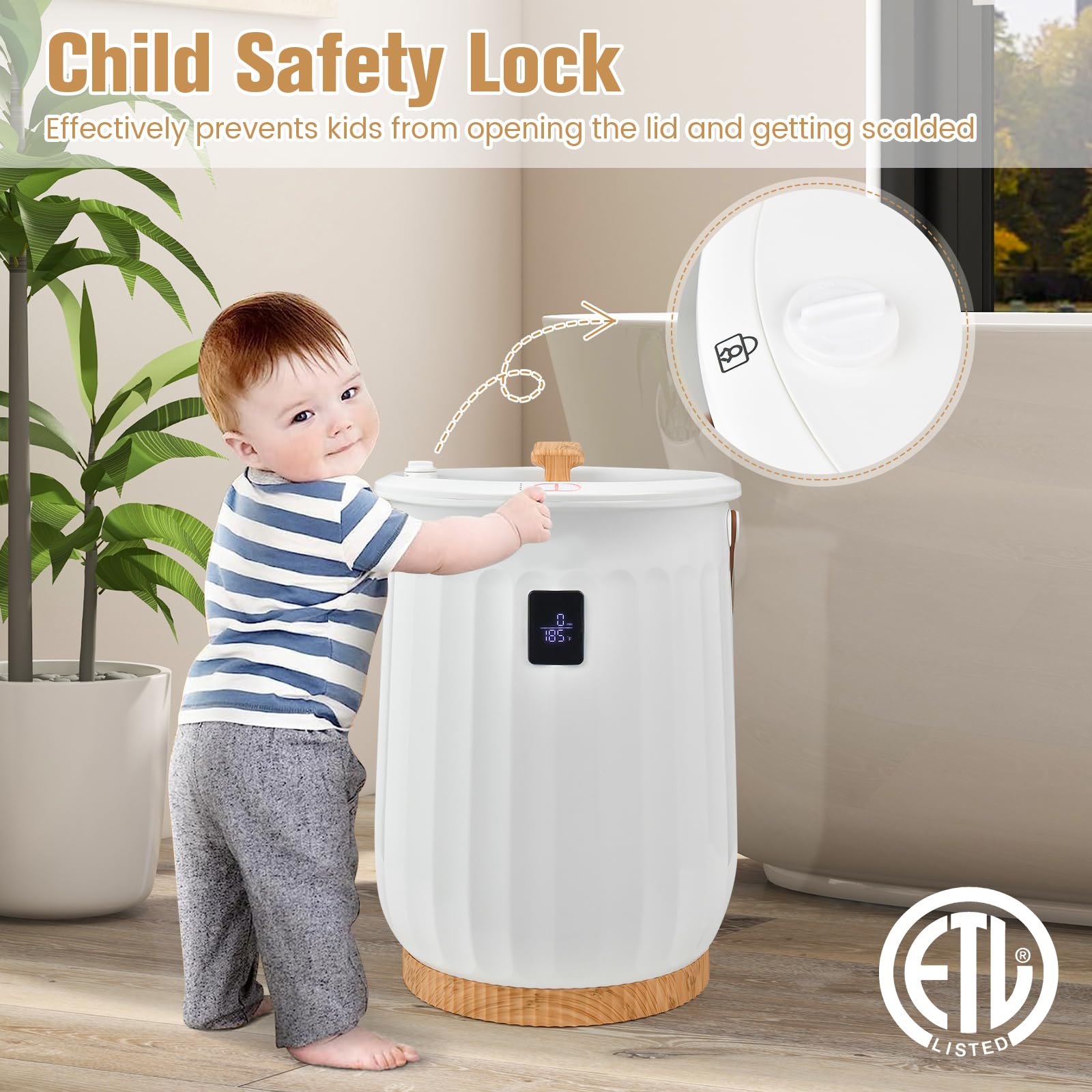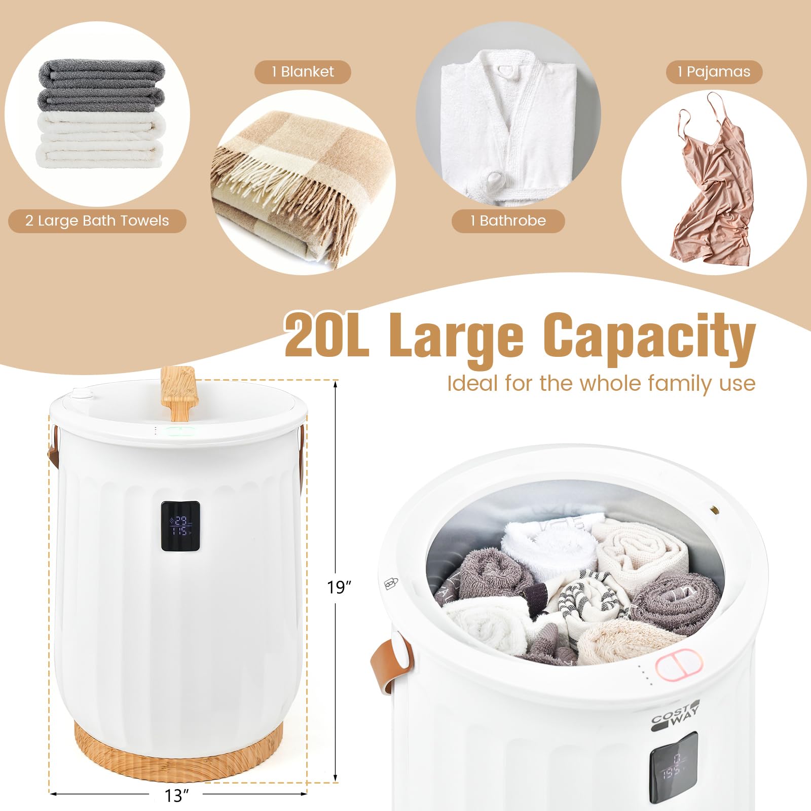 This towel warmer bucket will heat up rapidly within minutes and warm up towels inside and out evenly, without leaving any cold spots. With a large capacity of 20L, the towel warmer can hold a large number of towels or other laundry, like bathrobes, stockings, pajamas, etc. Besides, there is a fragrant disc holder for you to customize your own favorite flavor. With a clear LED screen, 2 touch buttons and 4-gear timer (15-30-45-60 minute), you can conveniently adjust the warmth level to your liking. For added safety, the towel warmer bucket is equipped with a child safety lock, ETL certification and hot surface indicator light. Plus, when it turns red, the interior surface is too hot and unsafe to touch.