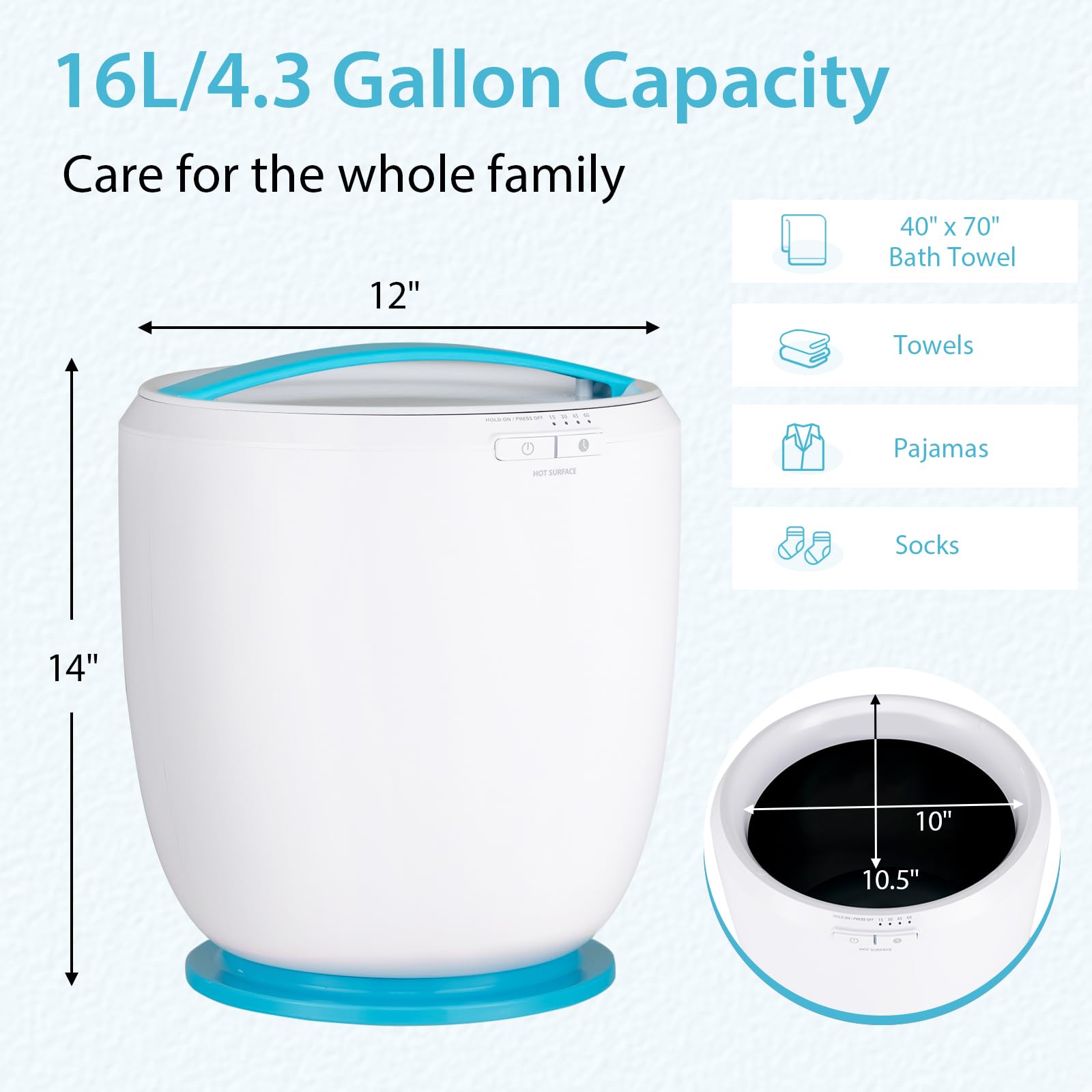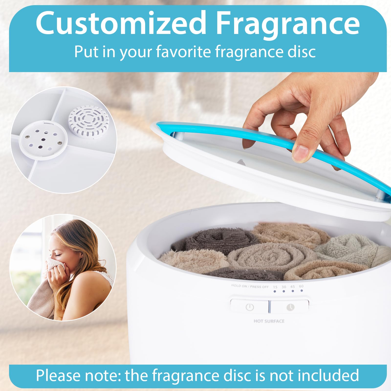 • [Large Capacity & Customized Fragrance]: This bucket towel warmer with 16L/4.3 gallon capacity can warm a 40" x 70"/101 x 178 cm bath towel, pajamas, towels, socks, etc. Besides, you can put in your favorite fragrance disc to enjoy fragrant towels. Please note: the fragrance disc is not included.