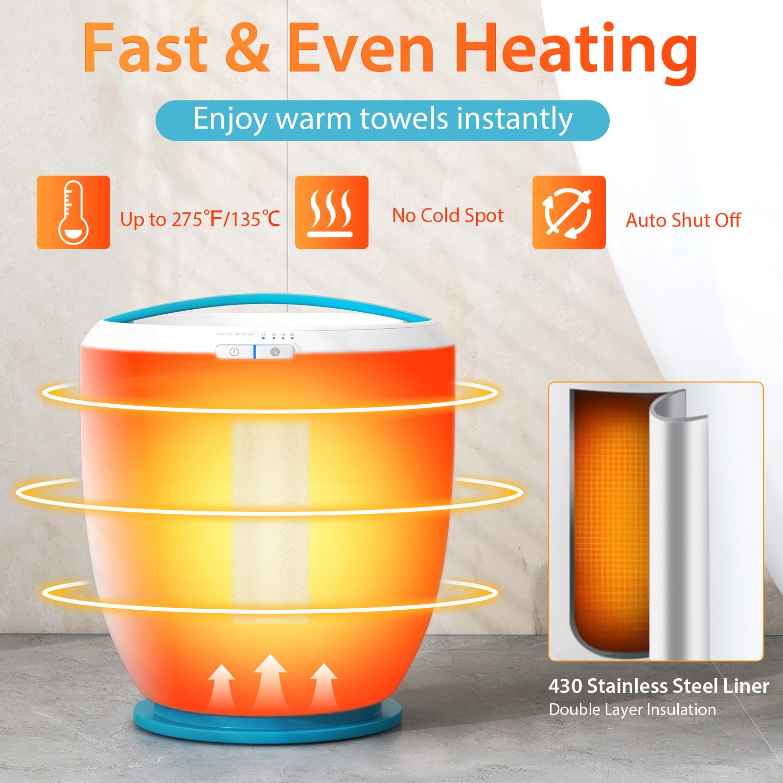 • [Fast & Even Heating]: Featuring a 430 stainless steel liner and double layer insulation, this towel warmer bucket allows you to enjoy warm towels instantly, with no cold spot left. It will heat up quickly and reach the temperature of up to 275?H/135℃within 15 minutes.