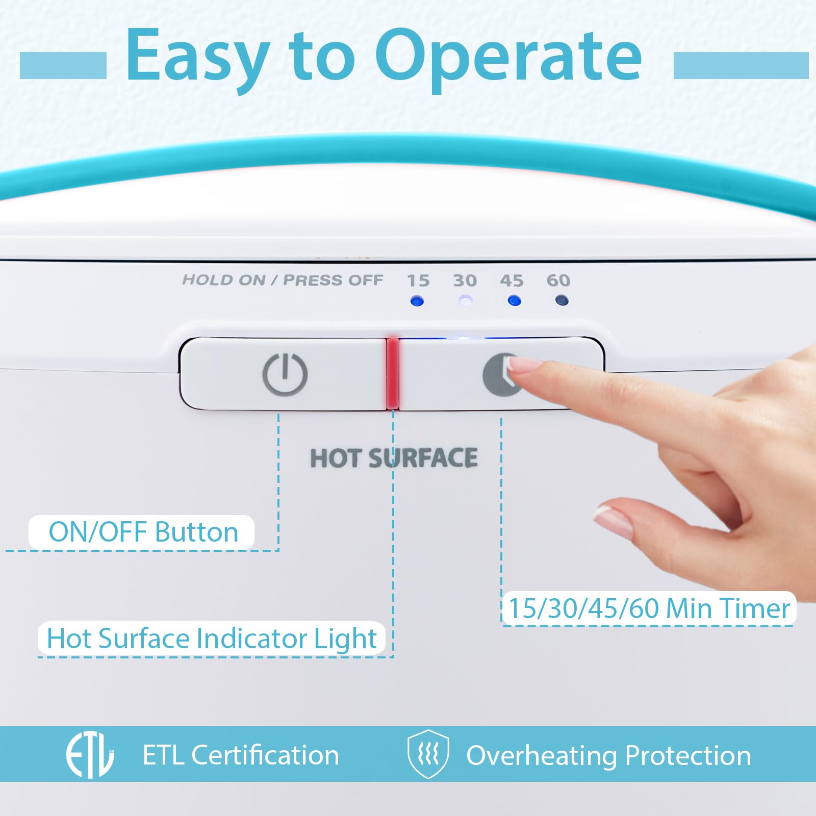 • [Simple Operation & Enhanced Safety]: Equipped with on/off button and 15/30/45/60 min timer, the towel warmer is easy to operate. And it will shut off automatically when the set working time is up. Designed with safety in mind, the bath towel warmer has ETL certification, overheating protection and hot surface indicator light.