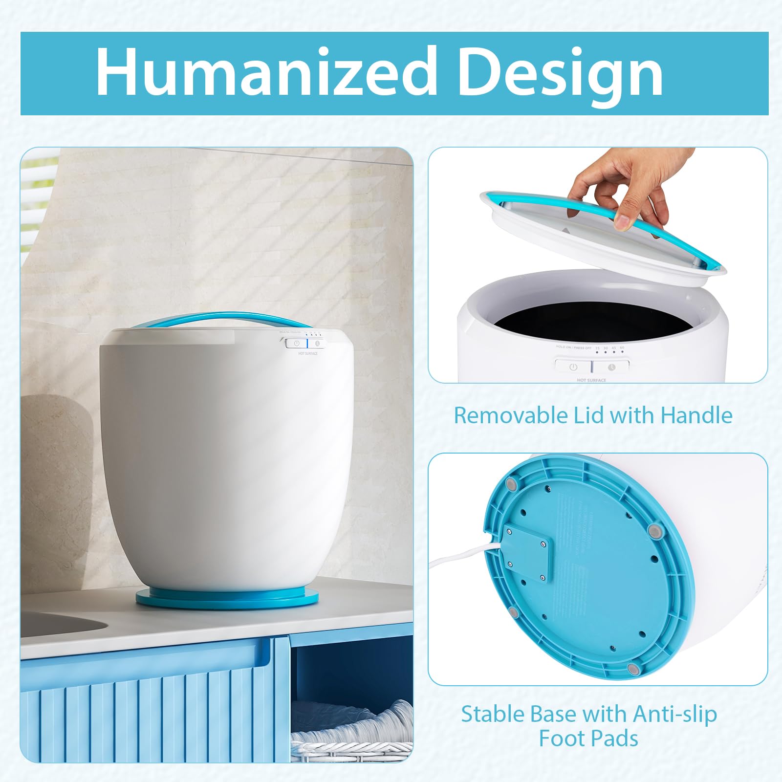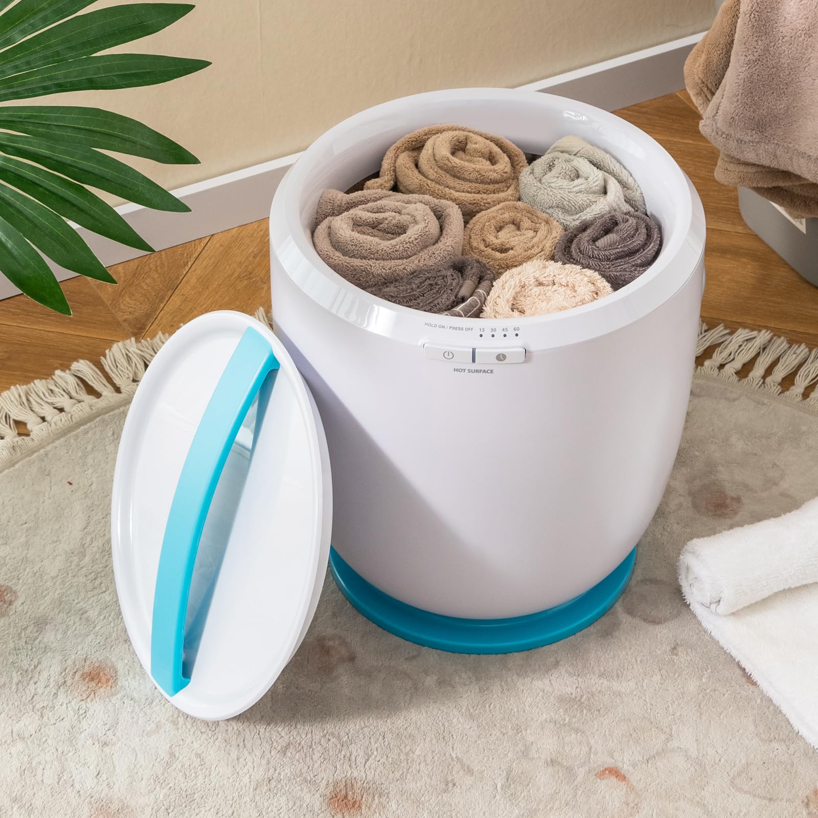 • [Humanized Design & Compact Size]: The stable base with anti-slip foot pads ensures reliable use. The removable lid with handle makes it easy to clean the inside of the towel warmer bucket. Additionally, this compact and lightweight countertop towel warmer allows for handy storage and transportation.
