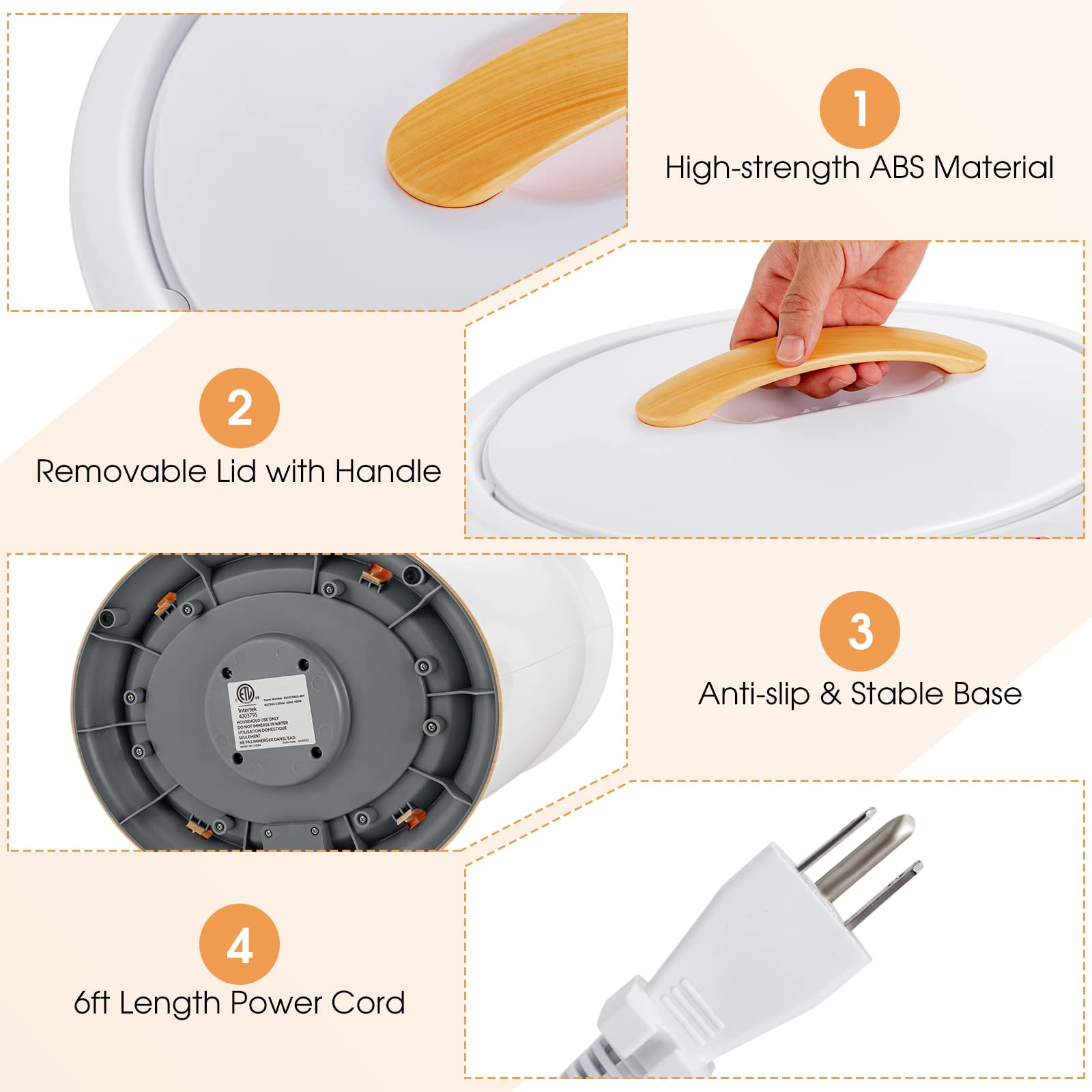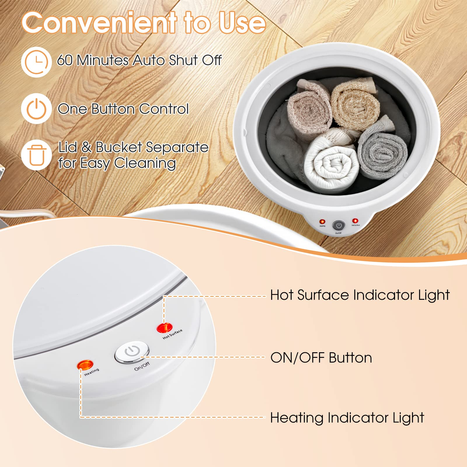 • [Easy to Operate & Use] Thanks to the one-button control design, this towel warmer bucket is convenient to operate. 60 minutes auto shut off ensures safe and reliable use in case you forget to turn it off. What's more, when the inner surface reaches 131°F, the hot surface indicator lights up, reminding you not to touch the bucket inside.
