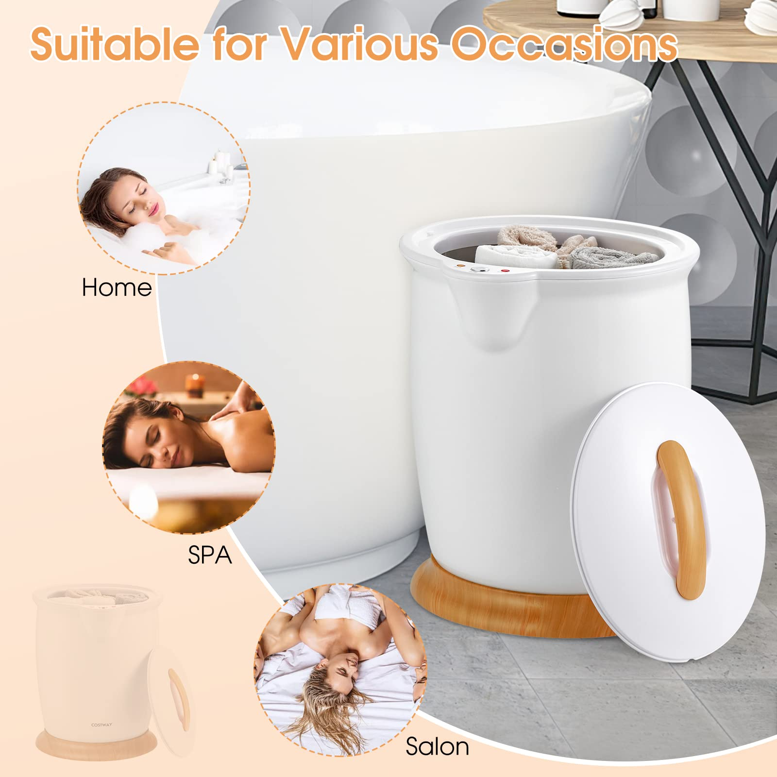 • [Compact & Stylish Warmer] This bucket heats the towel inside and out for a warm and luxurious experience all year round. The lightweight and compact design allows you to easily move the towel warmer from room to room. Plus, its wood-textured style adds a touch of beauty to any space, ideal for the home, spa, salon, hotel, pool house, etc.