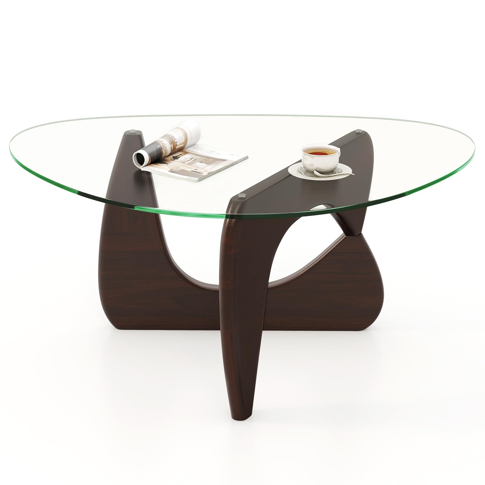 This coffee table with a stable triangle design is a stylish addition to any modern space. Its tempered glass tabletop is both enduring and easy to maintain, with added anti-slip pads for stability. Supported by a sturdy base that is made of natural rubber wood, this center table can hold up to 130 lbs and offers 3 adjustable configurations to fit your style and space requirements. Measuring 32.5”L x 22.5”W x 15.5”H, this smooth piece allows for optimal adaptability for wide use.