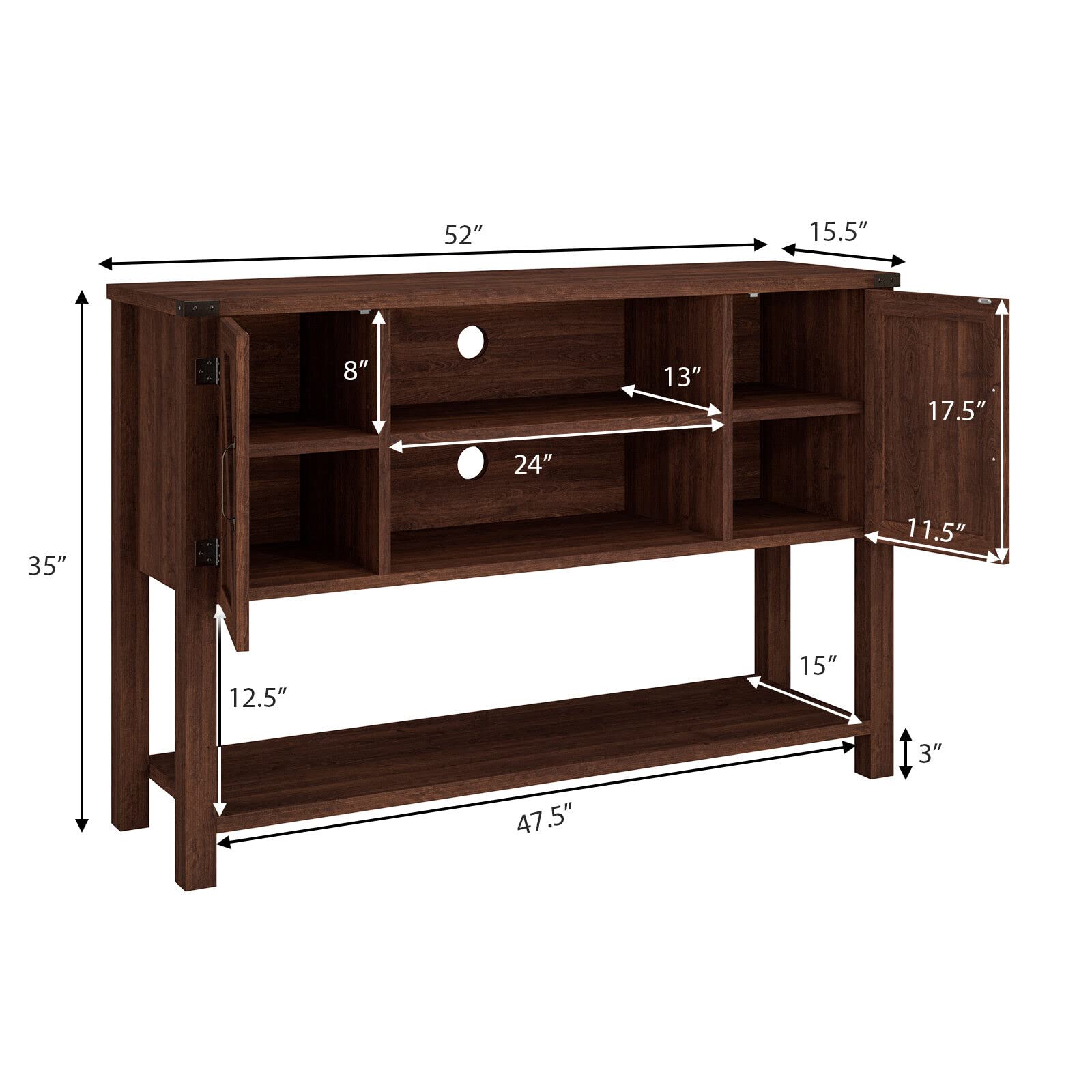 Elevate your entertainment space with the stylish TV Stand that accommodate 60" flat screen TV. The considerate back design allows you to run wires easily and neatly through the large wire management holes in the back of the unit to keep all your components in good order. The clean lines of this TV Stand and the retro finish with metal hinge makes this piece stand out in any room. It features multiple open shelves for numerous audio components. Two side cabinets provide additional concealed space for storing movies, music, video games, gaming controllers and other items.