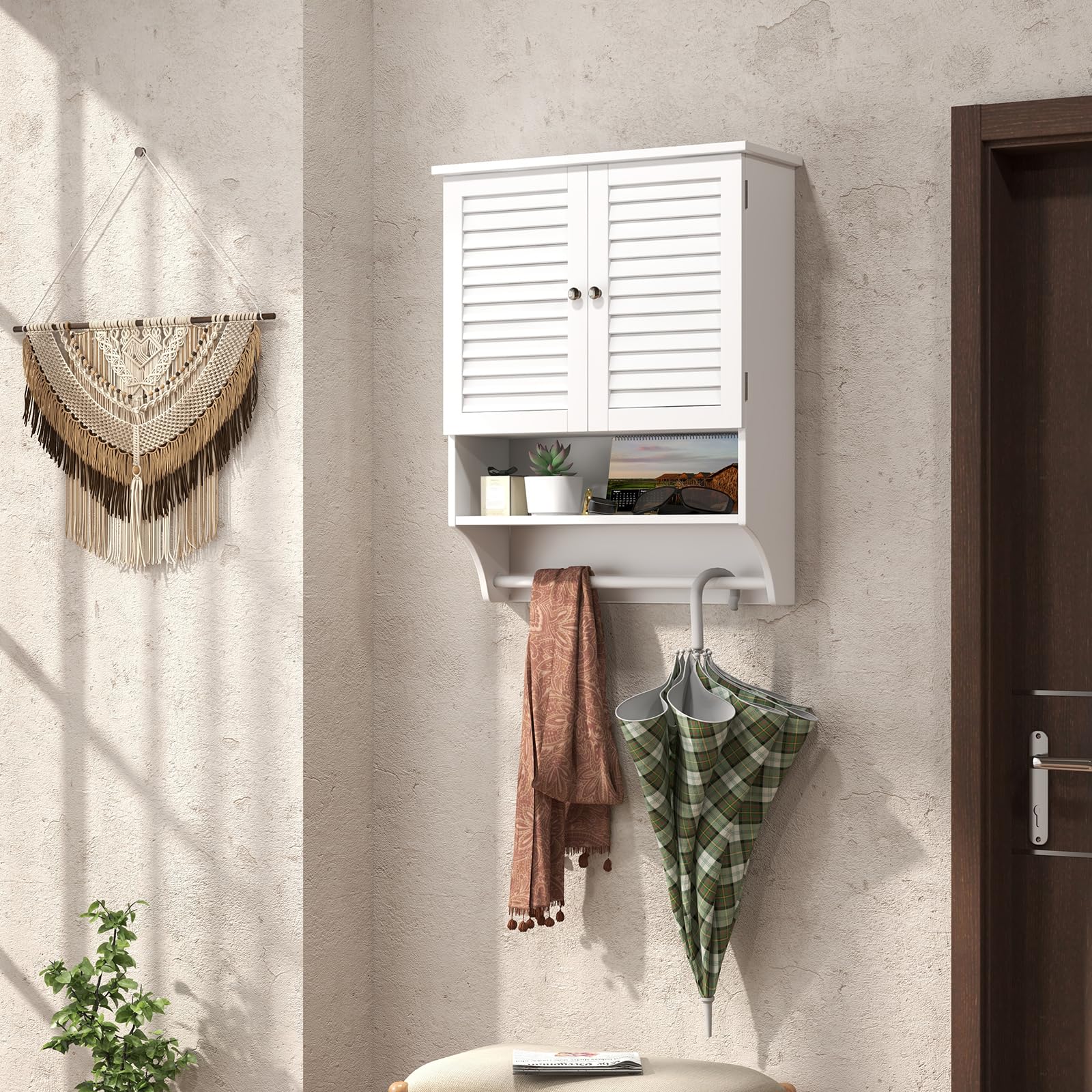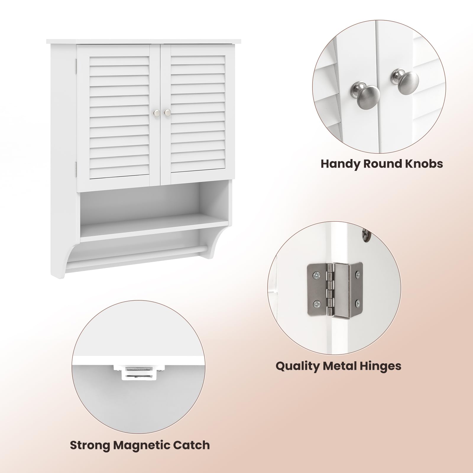 The double door cabinet with a towel bar will provide plenty of storage options. You can store your necessities like toothbrushes, facial cleanser, shampoos, and toilet paper on the large cabinet and open compartment and hang towels on the towel bar for easy reach. With inner 3-level adjustable shelf, you can freely adjust it to accommodate larger items. Thanks to the wall mounted design, this bathroom storage cabinet is able to maximize the vertical space to improve the space utilization. And the white storage cabinet with louvered doors ensures ventilation and aesthetics, matching perfectly with your living space like bathroom, living room, kitchen.