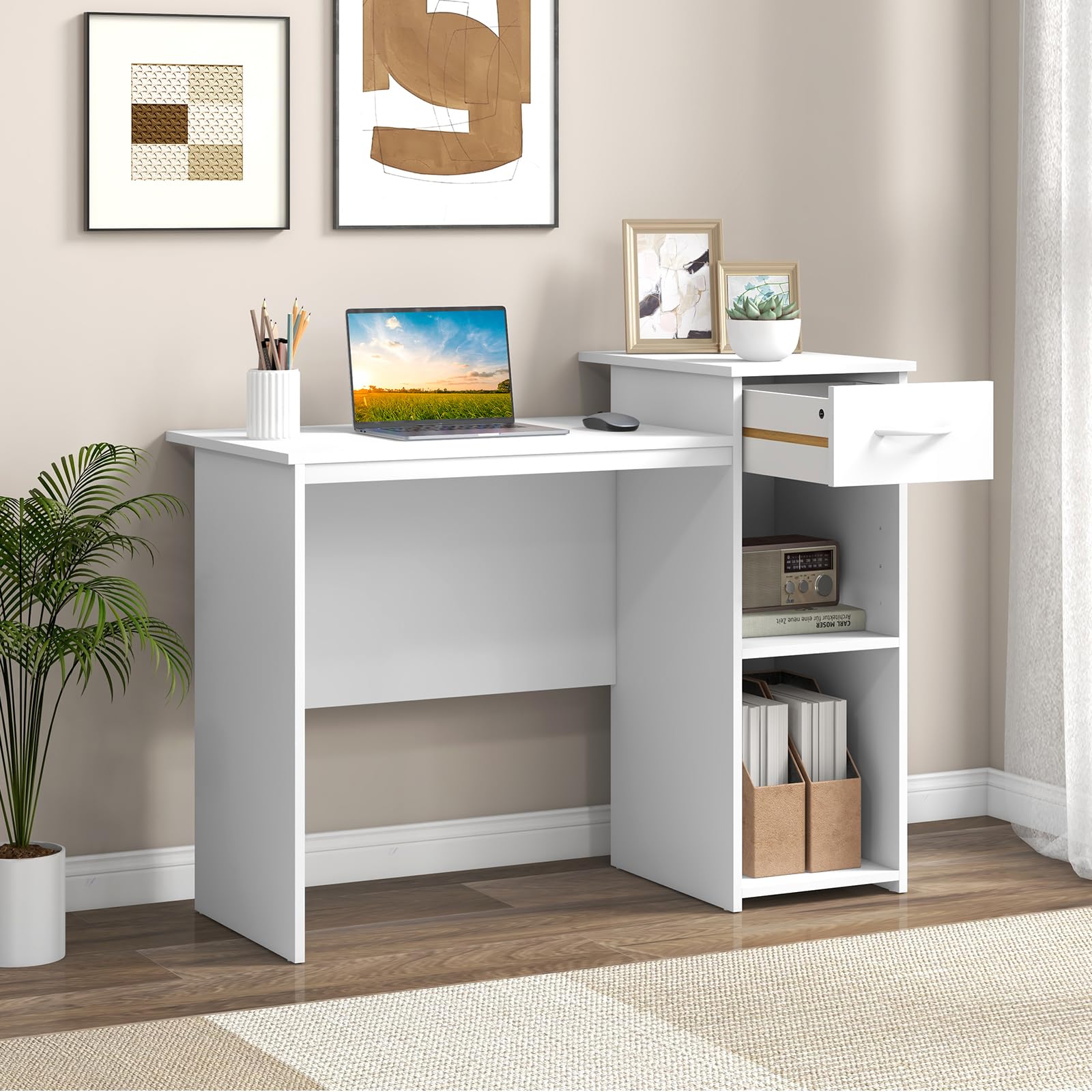 - Organized Workspace:?Featuring a wide tabletop and an extra raised platform, this computer desk keeps your essentials neatly stored and easily accessible. Moreover, the handy drawer frees up additional tabletop space.