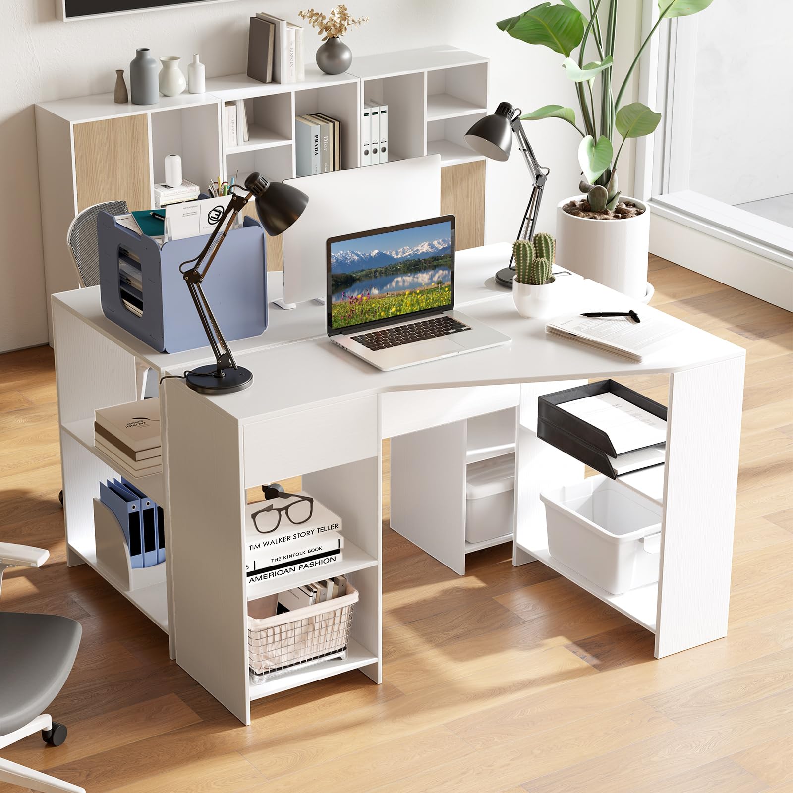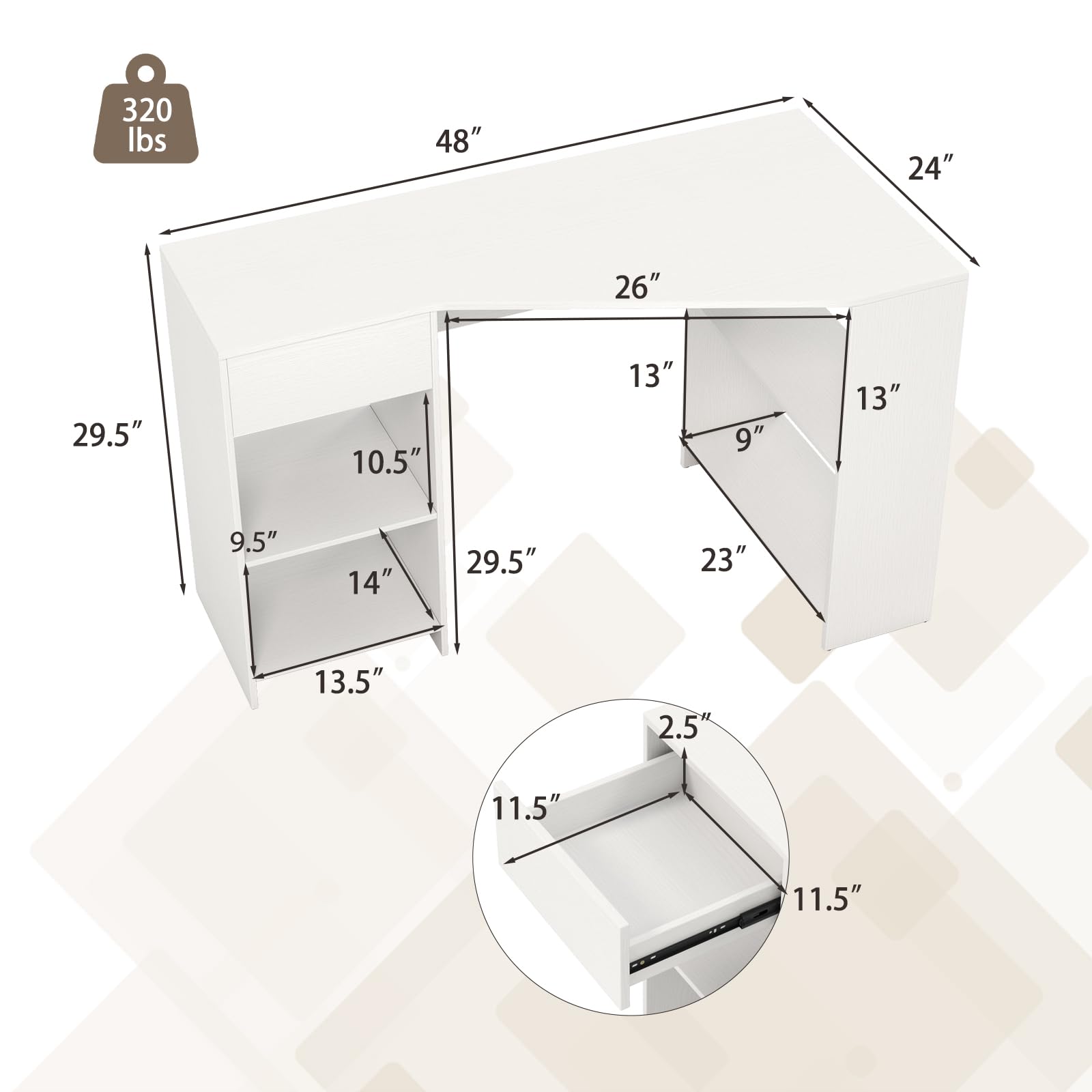 Featuring a right-angle shape, our computer desk combines unique style with practical functionality, fully utilizing corner spaces. The wide top is perfect for setting down your work laptop or a sprawling art project, while the drawer and 4 open shelves keep your favorites and essentials neatly within reach. Reliable in its details , the study desk features a smooth surface for hassle-free cleaning, anti-slip foot pads for added stability, and smooth drawer slides for easy opening and closing . Whether you're setting up a home office, a cozy vanity, or a compact workstation, our modern corner desk is the perfect choice to upgrade your space!