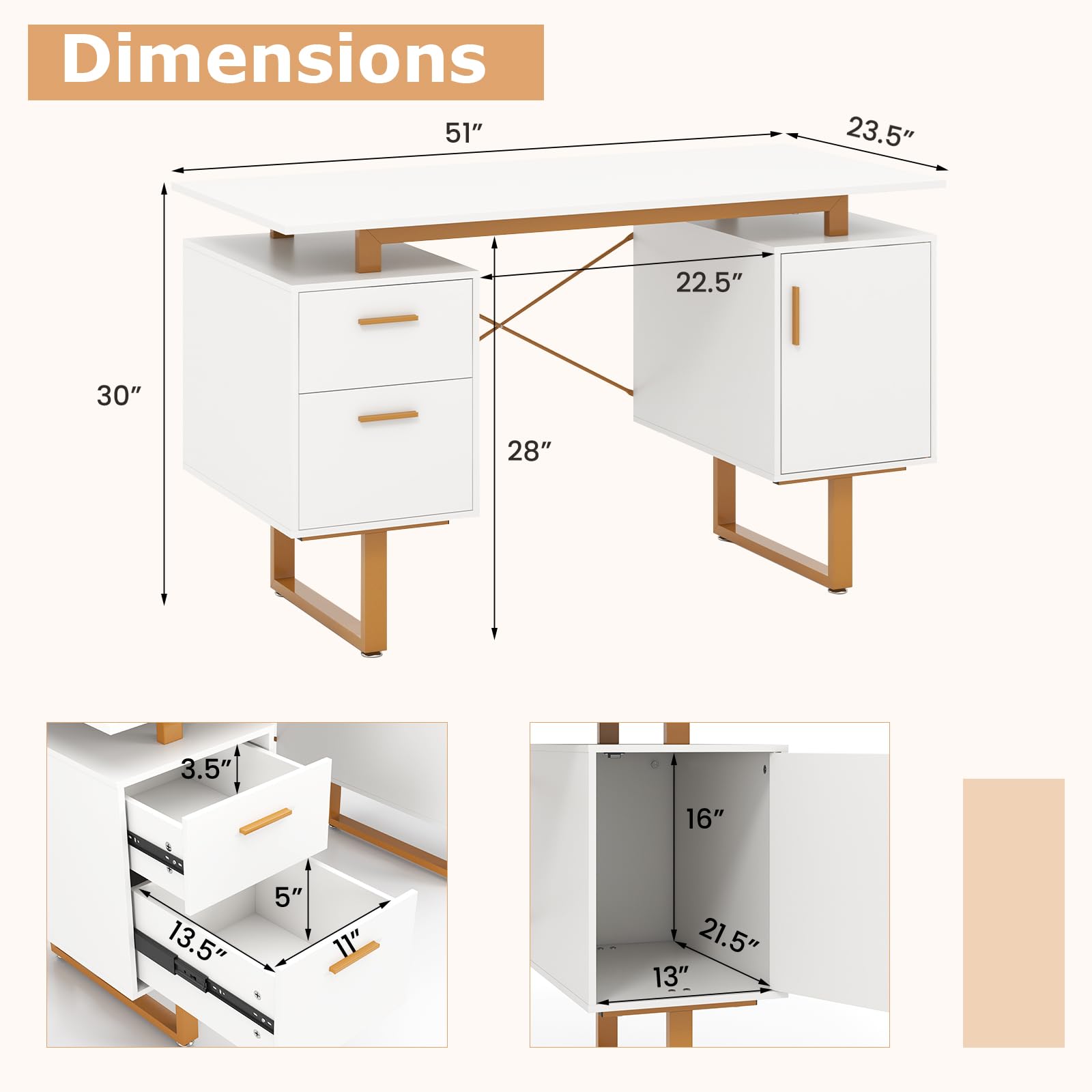 Upgrade your work space with this stunning 51” white computer desk. Perfect for home offices, studies, or as a stylish vanity, this versatile desk features a large tabletop for your computer, books, and makeup essentials. Crafted for durability, the sturdy metal construction ensures stability, while adjustable foot pads provide support on uneven surfaces. Enjoy organized living with a cabinet, 2 pull-out drawers, and open shelves designed for effortless access to your belongings. Experience seamless functionality with smooth slide rails, sleek metal handles, and magnetic catch for secure storage. The chic floating tabletop and sophisticated golden frame embody modern elegance. Elevate your home decoration and streamline your productivity with this elegant and functional home office desk today!