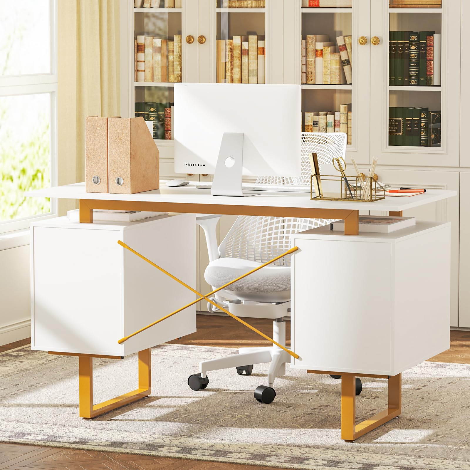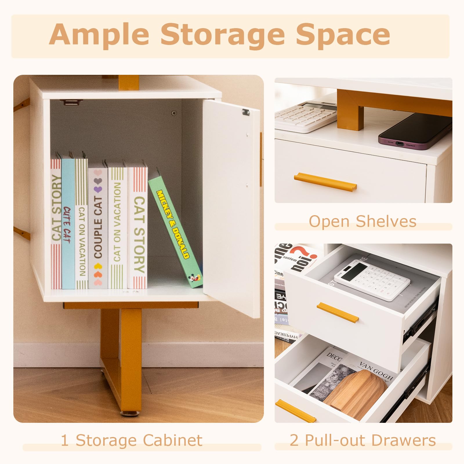 • Modern Elegant Design: The sleek white finish combined with a stylish golden frame creates a contemporary aesthetic, elevating the decoration of any living room, study, office, or bedroom. The white desk adds both style and functional storage to your home.