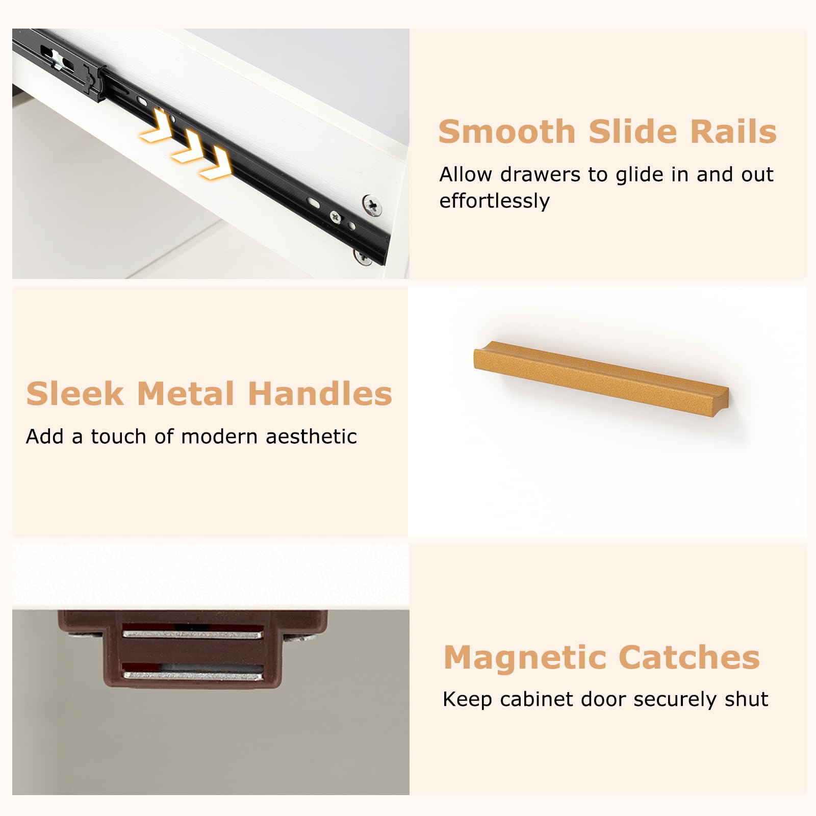 • More Convenient Details: Equipped with smooth slide rails and sleek metal handles, the storage drawers glide open and closed effortlessly. The magnetic catch keeps the cabinet door securely closed. The smooth surface is easy to wipe clean, making daily maintenance a breeze.