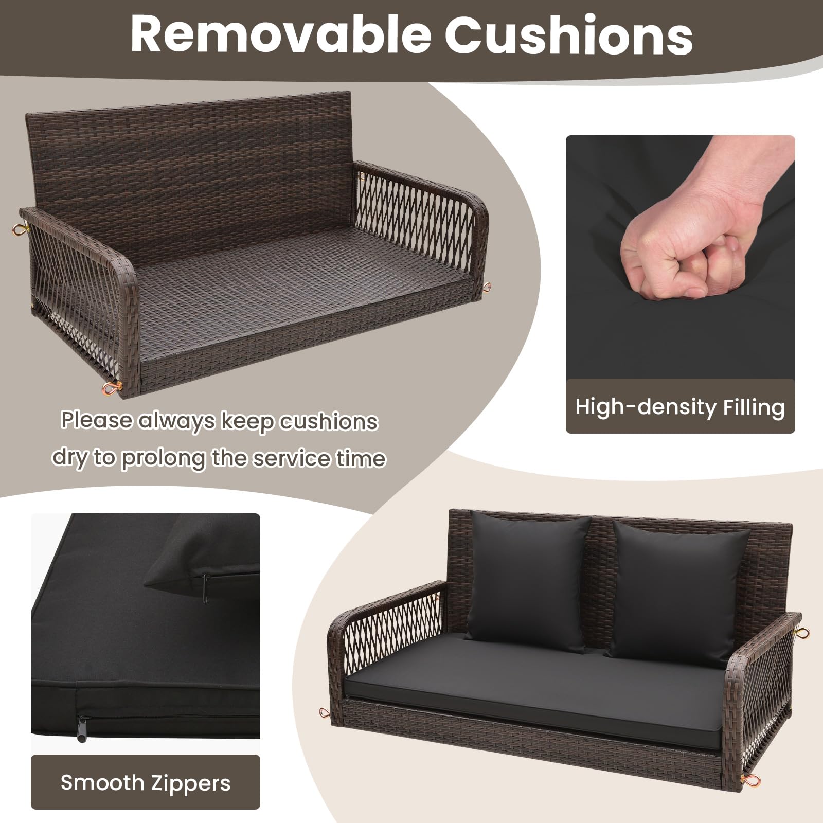 - Wicker Porch Swing: Made of hand-woven mix brown PE wicker, this outdoor swing bench is colorfast and sun-protective for outdoor use. And the wicker surface makes you feel breathable if remove the cushions.