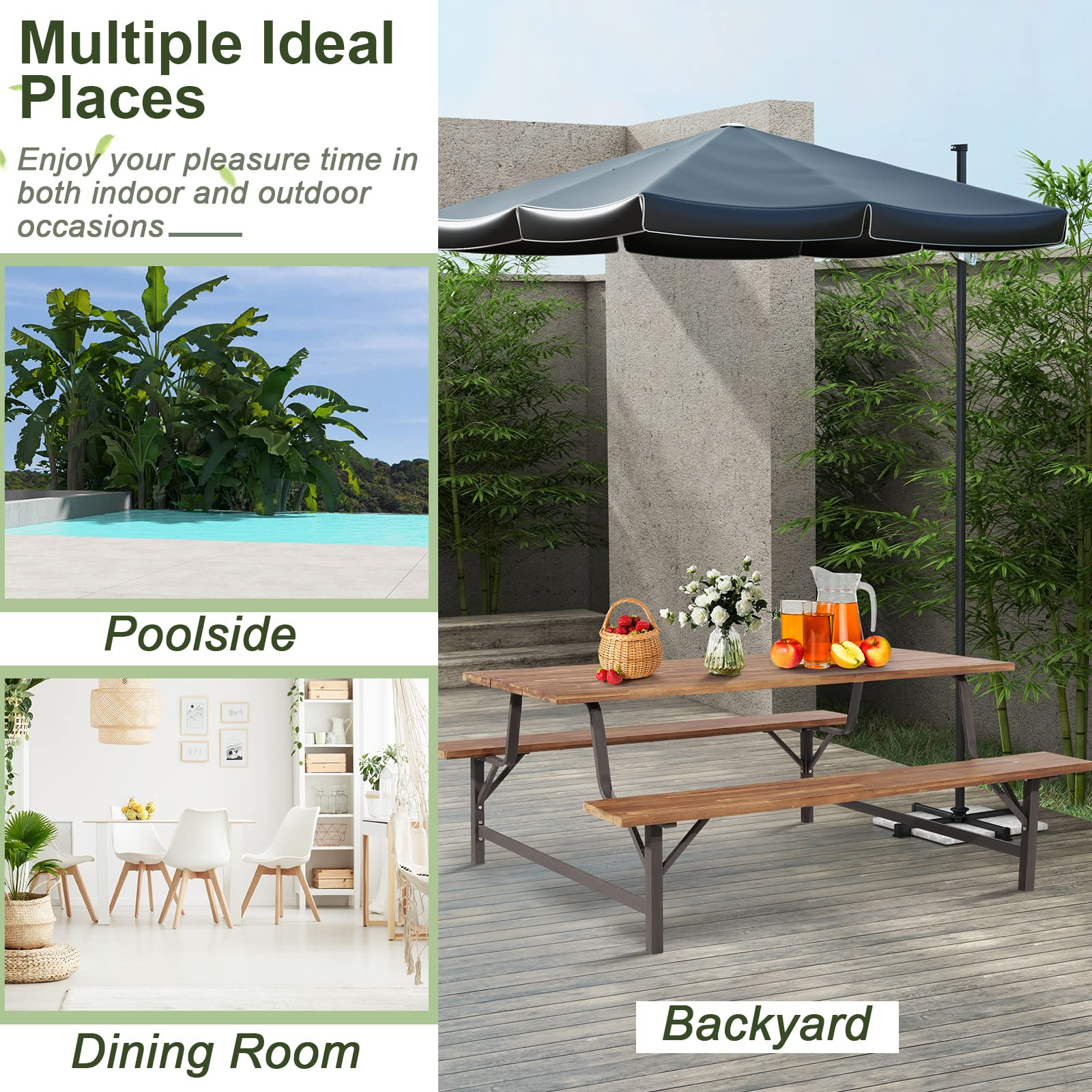 Both the picnic table and benches are 71" in length, providing ample space for 6 people to sit. And the tabletop is designed with a 2" umbrella hole, allowing you to insert a patio umbrella, and thus you can relax in the sunshade. Made of selected acacia wood, the tabletop and the 2 seats are not only solid and durable but also natural and elegant. Plus, the heavy-duty metal frame with the powder-coated surface is resistant to rust and deformation, ensuring long-lasting service life. Whether you want to have a picnic, barbecue, or camping, this table and bench set will always satisfy your demands.