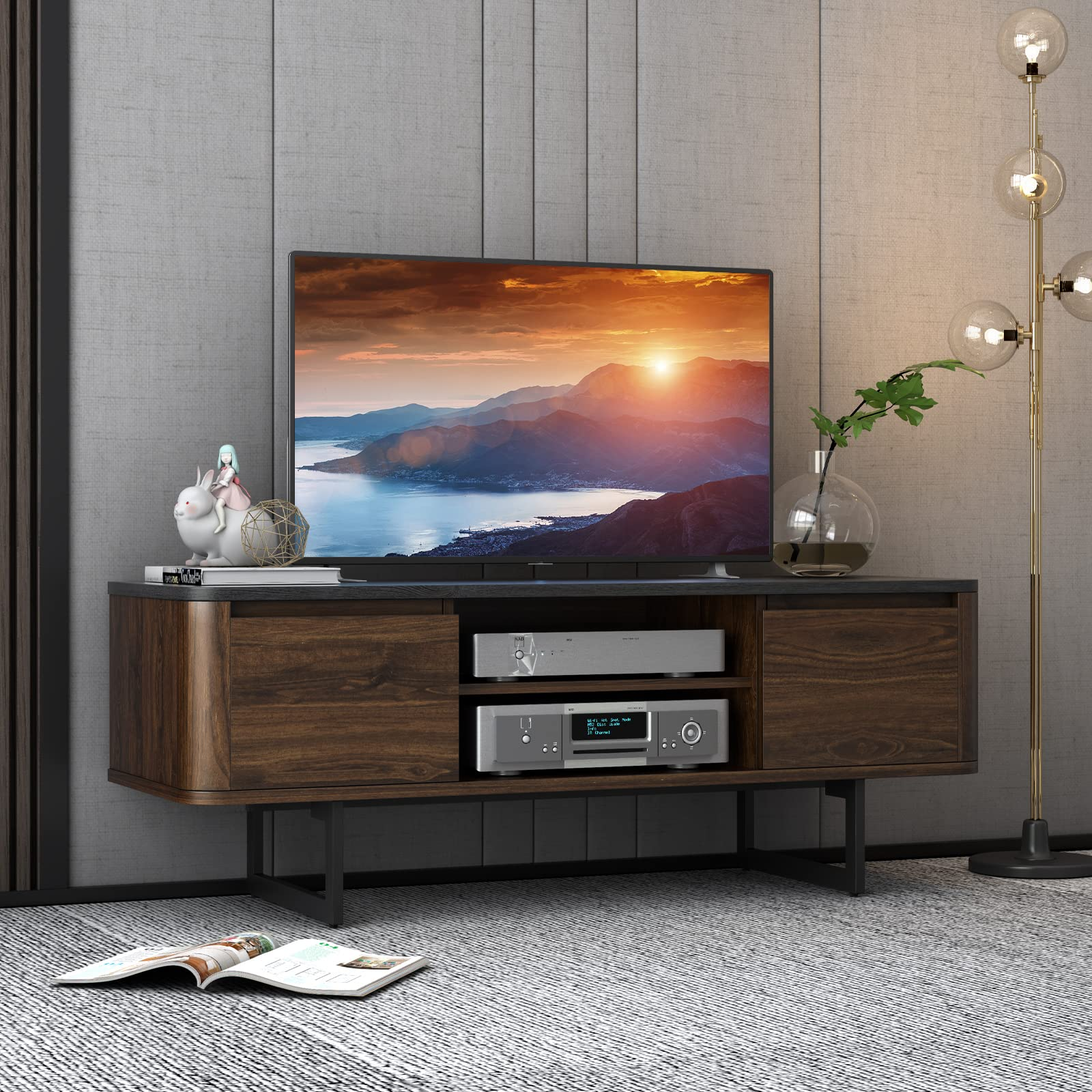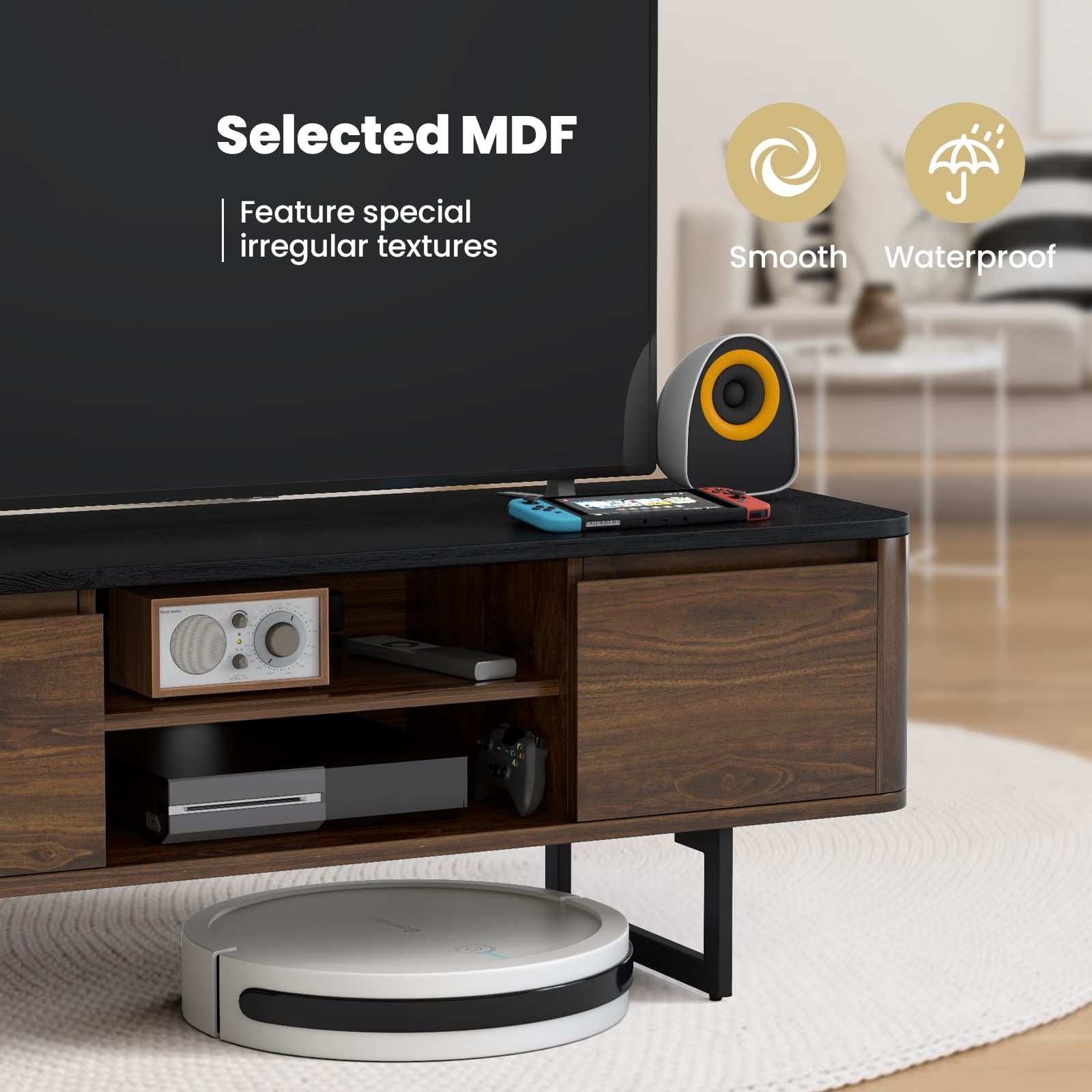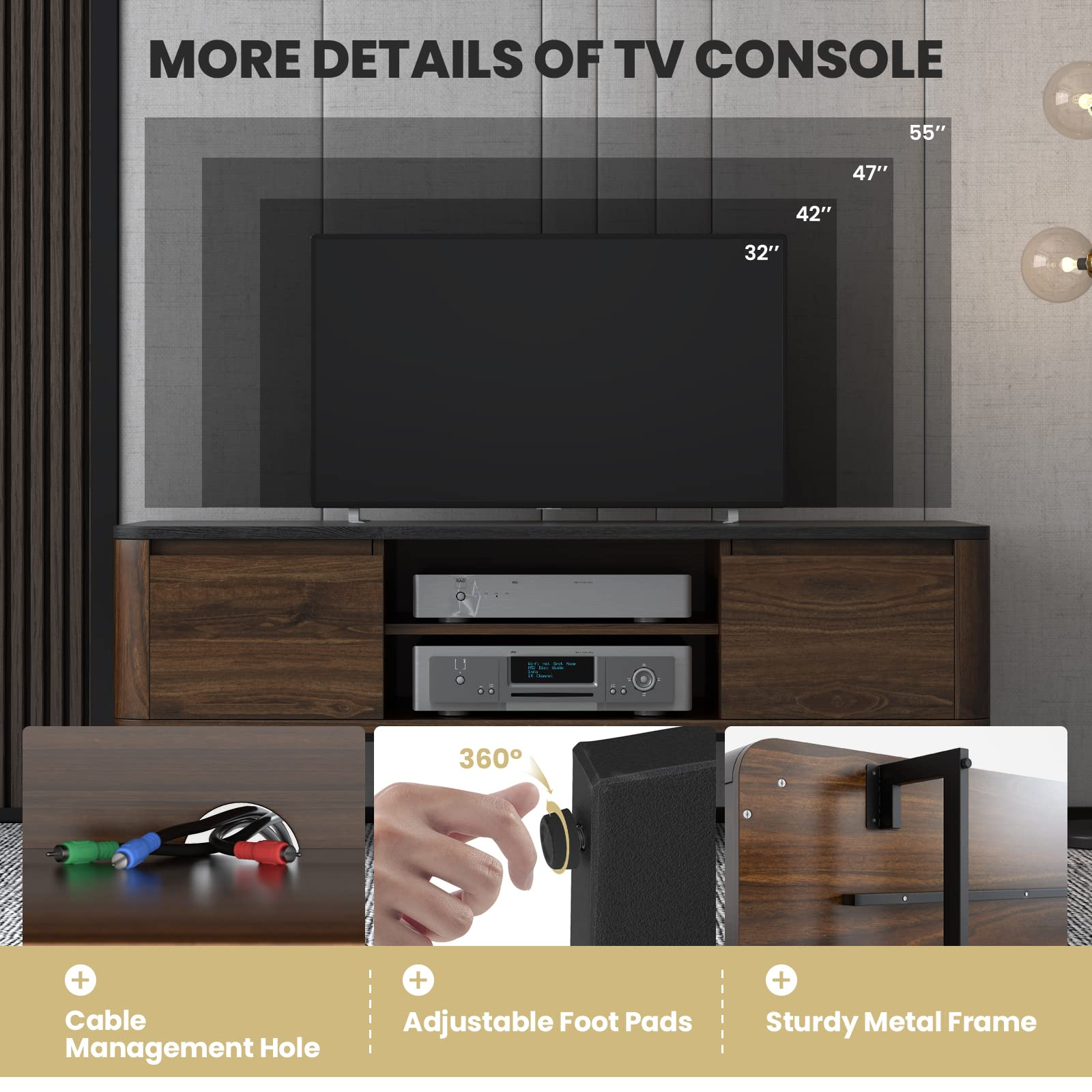 Our 2-door TV stand is a good piece of furniture for you to display TVs up to 55 inches in your living room or bedroom. Supported by a reinforced steel base, the TV console performs a great weight capacity of 121 lbs. The adjustable foot pads enhance stability. It also has diverse storage areas for a tidy environment, a wide cabinet top for decoration display, a 2-tier shelf for entertainment media, and 2 compartments for sundries. Plus, on the back, there is a cable hole organizing wires in a neat manner. At the same time, the design of the entertainment center also impresses a lot of people. The vintage color scheme, makes your original ordinary TV corner become eye-catching.